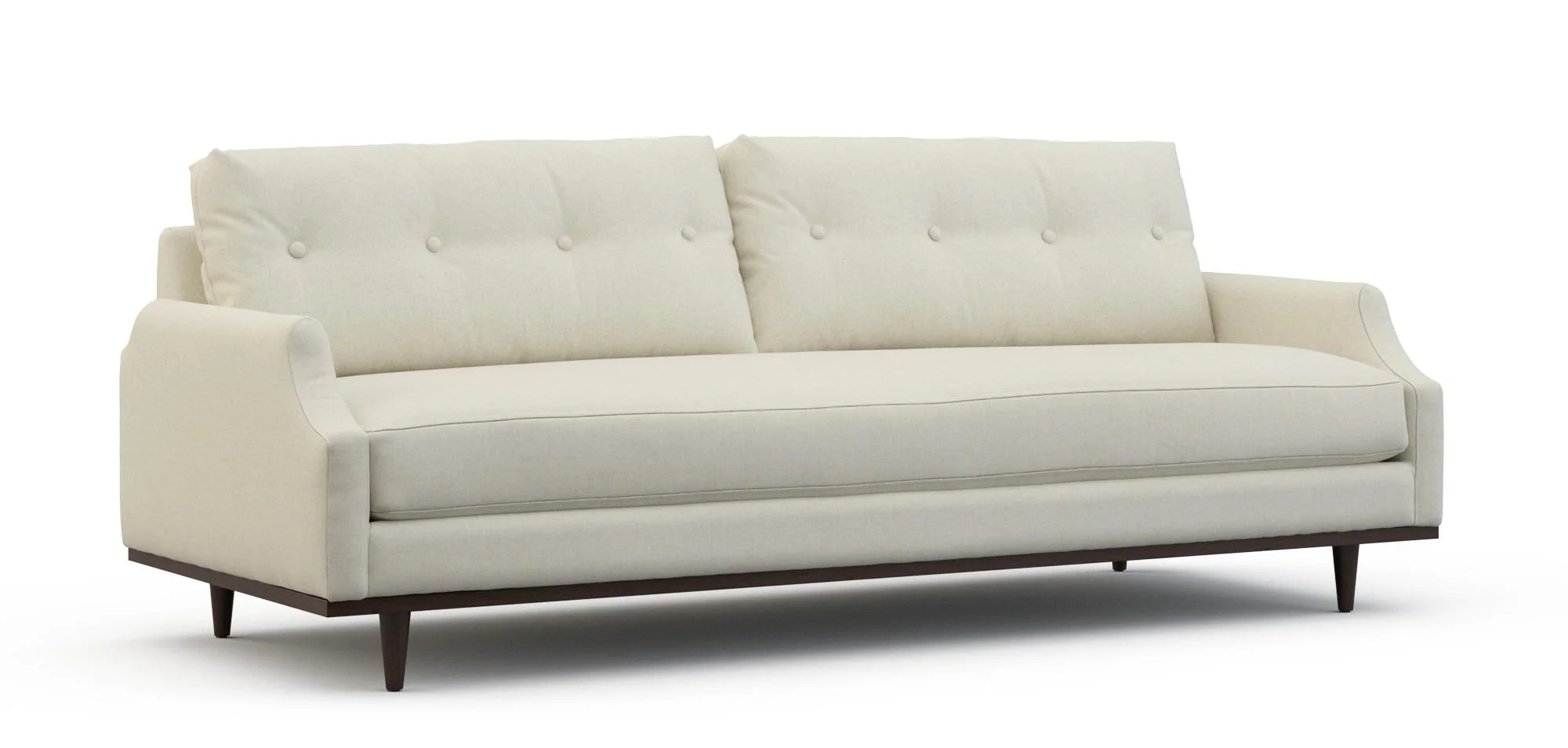 The loose pillow back cushion and tufted seat back style add a touch of sophistication, while the walnut finish on the wood legs and base provides a warm and inviting tone. With a seat depth of 22 inches, this sofa offers a comfortable and relaxing seating experience. You can also customize the upholstery to fit your personal style, making this sofa a unique and thoughtful addition to your home.