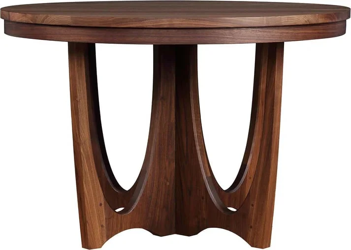 With a light, airy base composed of sculptural ellipses, the Walnut Grove Round Dining Table offers a flexible and beautiful option for modern interiors and dining rooms. Plenty of open space and a graceful, curved form make this walnut dining table a beautiful fusion of traditional craftsman quality and mid-century modern influence. It parts in the middle to accommodate two 18-inch leaves, taking on a new identity as it expands from an intimate 46-inch round top to an 82-inch long table with race track ends.