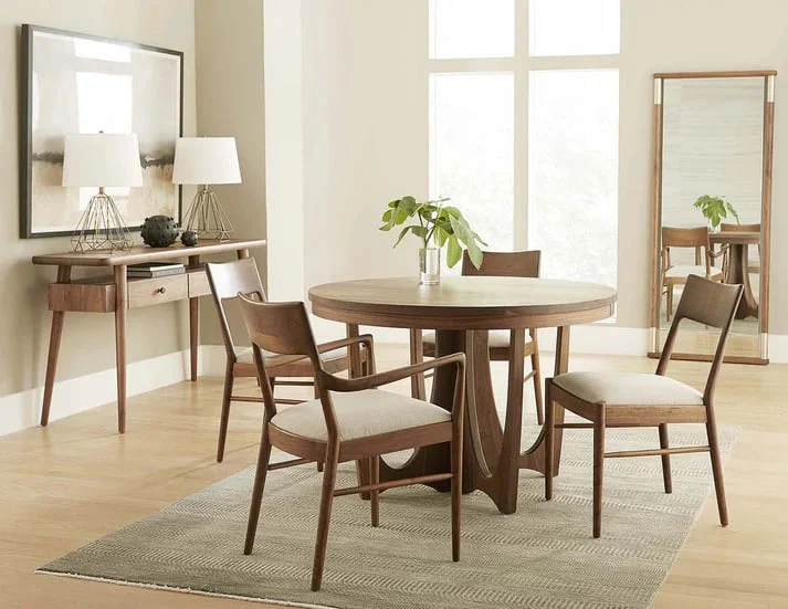 The Walnut Grove Mid-Century Modern Round Dining Table with 18" Leaves, made by Stickley,