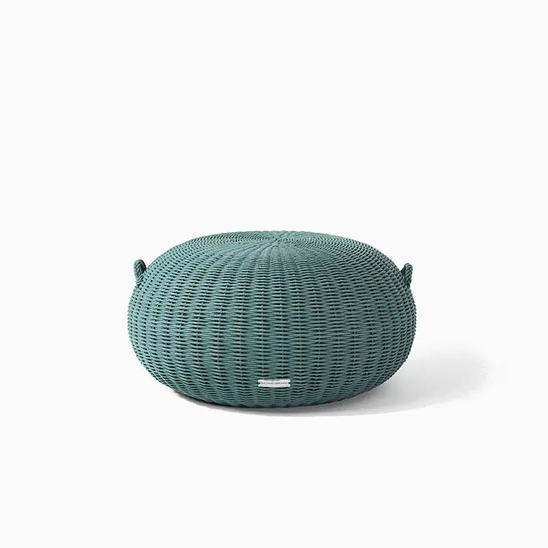 moreThe woven Juno pouf ottoman is a fun and functional piece that can be used with any collection as extra seating or ottoman. Juno poufs are crafted with an aluminum frame covered with high density padding protected by a waterproof cover and finished with woven rope. The top is supported underneath by webbing to add extra comfort when used for seating. The Juno Collection of poufs are offered in two sizes and five lovely color options.