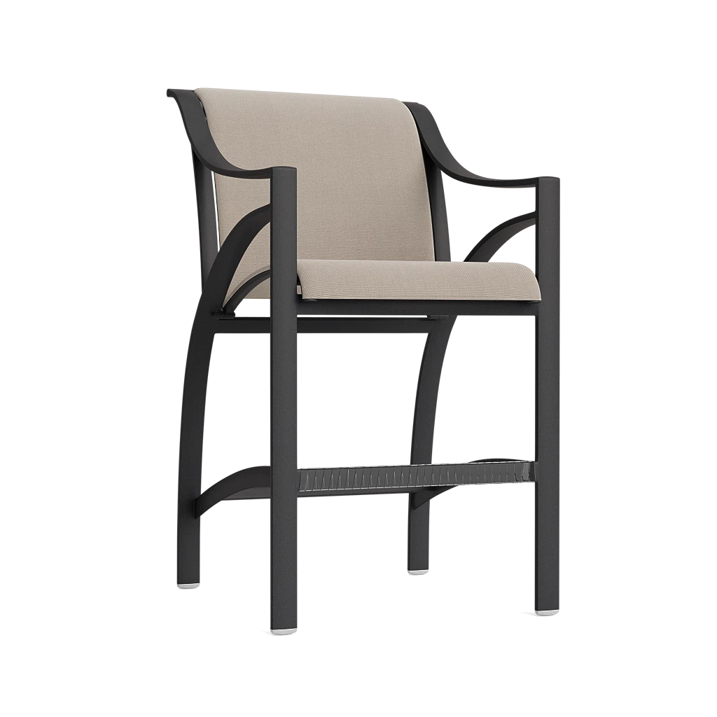 moreThe Bar Chair from our Pasadena Collection is a perfect combination of style and comfort. Sweeping lines seen on the arms and back legs highlight the beauty of the chair while curves stylishly continue into the crosspieces along the bottom, creating an effortless place to rest your feet. The conforming Versatex sling material is built for lasting durability, superb comfort and design flexibility.