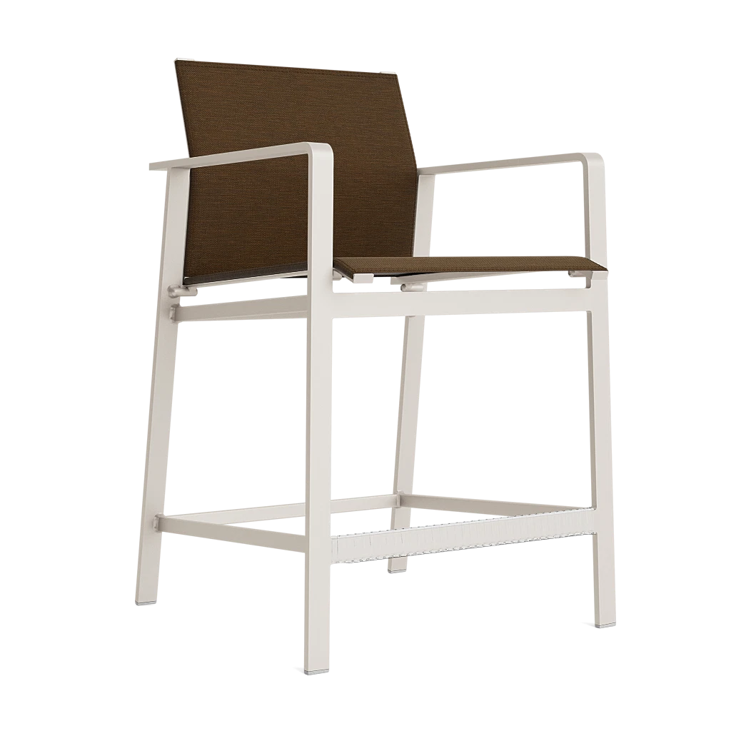 moreThe Swim Counter Stool with Arms represents a fresh, light and sporty perspective for outdoor and casual living spaces with its linear profile made of powder-coated aluminum frames and Versatex mesh taut sling upholstery. Its overall clean lines and simple angular detail of the backrest energize the spirit suggesting both movement and activity even at rest.