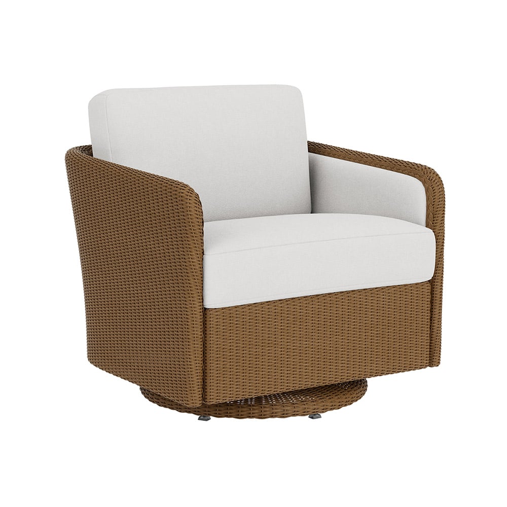 moreThe Visions Swivel Glider Lounge Chair is an innovation in Lloyd Loom wicker that uses a new upholstering approach to create a chic silhouette. Clean lines, moderate scale seating, and cushioned inset panels create a stunning modern profile.
