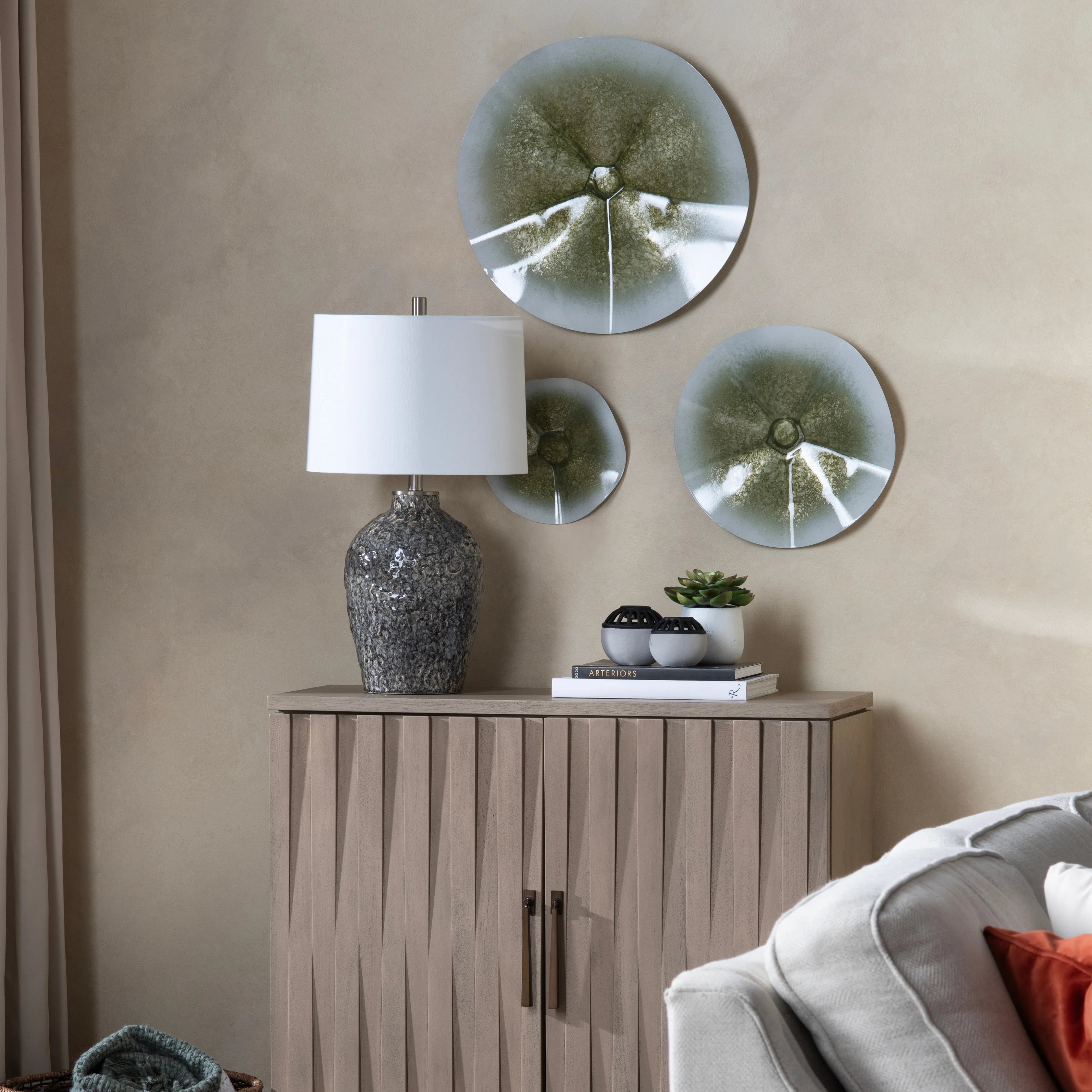 Textured ceramic body with multi-color finish featuring grey and blue undertones for a sophisticated look, Equipped with a 3-way socket to adjust brightness levels to suit your needs, White tapered drum shade made from a linen and polyester blend for a clean, contemporary aesthetic, Brushed nickel socket switch and a 6-foot clear cord for easy placement and operation, Compatible with a 150-watt bulb (not included) for ample lighting, Due to inconsistencies of various monitors, handheld devices, lighting, digital photography, and variances that occur naturally in materials, the color you see on your screen may vary slightly from the products received., Due to the various light bulb color temperatures (cool, daylight, smokey, amber, etc), there will be slight color variations in the lamp shade color.