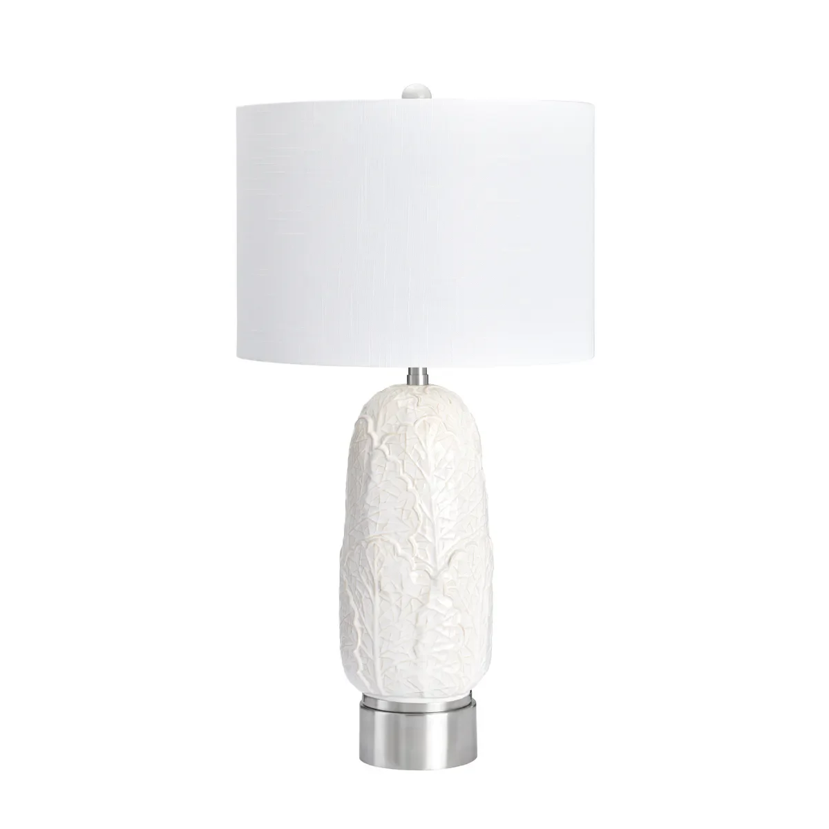 moreElegantly textured with a raised leaf pattern, this ceramic table lamp adds organic dimension to any room. The glossy white glaze enhances the sculptural detailing, while a white linen drum shade softens the look. A brushed nickel base grounds the piece with modern contrast. Fitted with a rotary socket switch, this lamp brings a fresh, nature-inspired touch to bedrooms, living rooms, or entryways
