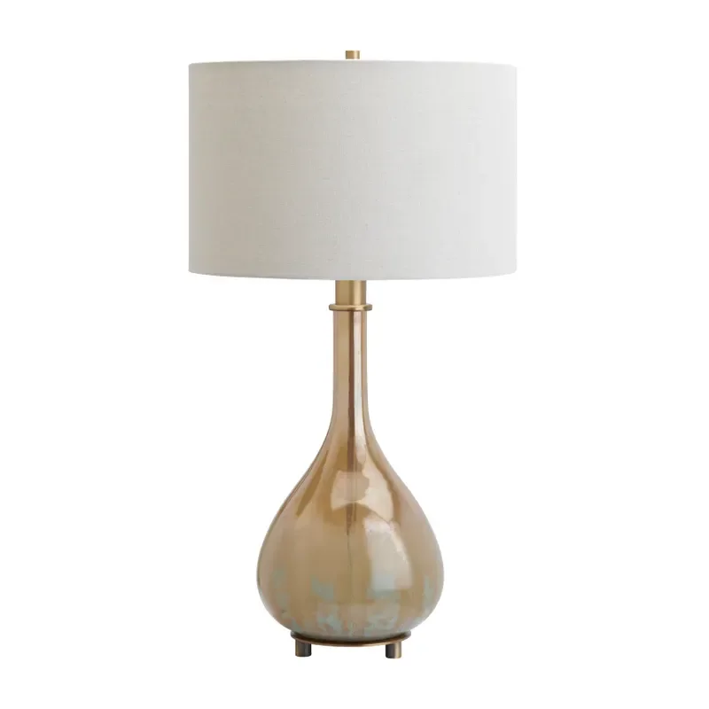 moreElegant and refined, this table lamp features a teardrop-shaped glass body in a champagne-tone reactive finish that subtly shifts in the light. Resting on a round metal base, the form is topped with a soft white linen drum shade for a balanced glow. A rotary socket switch offers convenient operation, blending modern function with elevated materials for stylish illumination in any room