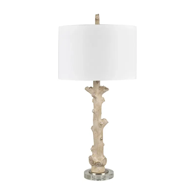 Natural form meets refined finish in this table lamp featuring a sculpted resin body with the texture and shape of a tree branch. The light wood-tone finish highlights intricate bark details, while a clear crystal base adds contrast and elegance. Topped with a smooth white linen drum shade and a branch-inspired resin finial, this lamp includes a rotary switch and supports a 150W bulb