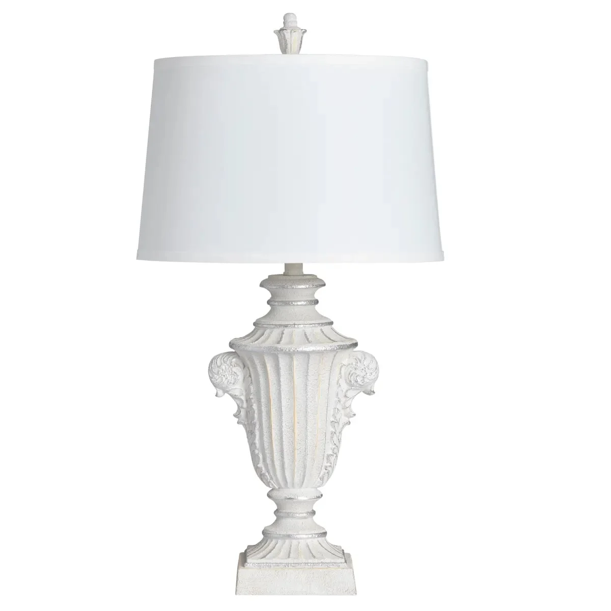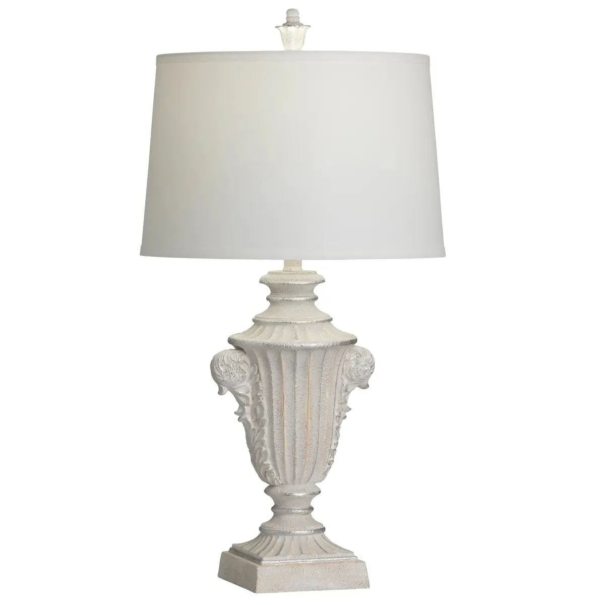- Sculpted in the French romantic era motif of leaves and flowers on a pedestal urn base. The antique white finish has been rubbed and worn to give this lamp a vintage look.
