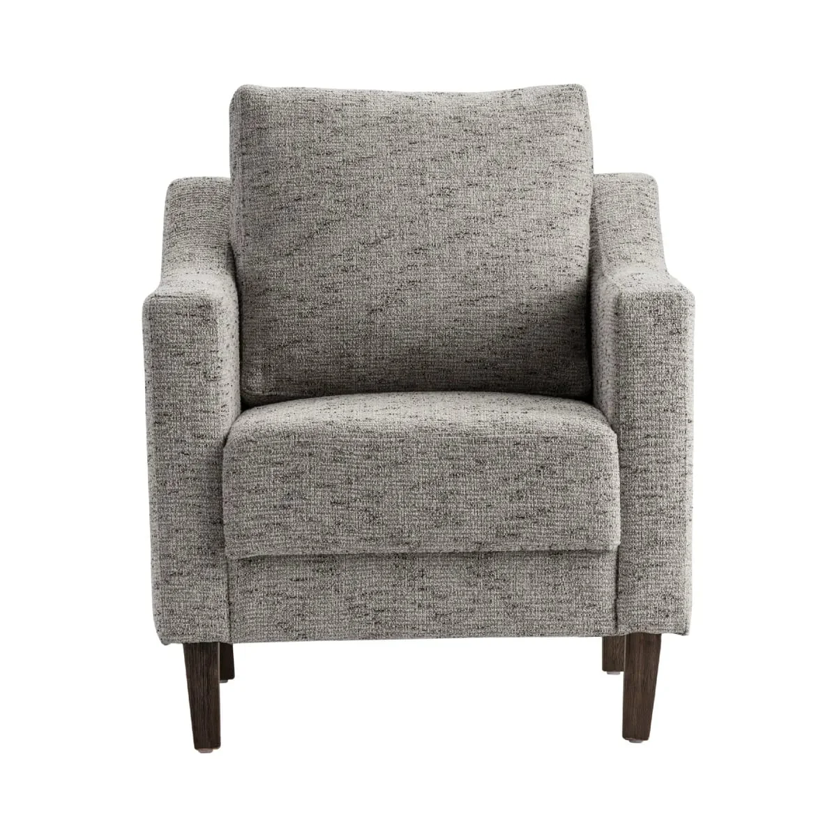 moreThe gray multitoned fabric finish adds to the modern feel. Comfortable padding in the seat and back cushion your downtime, with low arm rests for a wraparound feel. Strong straight legs in a black rubberwood finish complete the look.