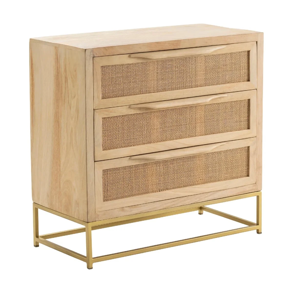moreEach drawer features a cane front. A gold, metal base holds up the light-brown wooden construction of the chest. This coastal, transitional piece makes the perfect accent piece for your living room or hallway.
