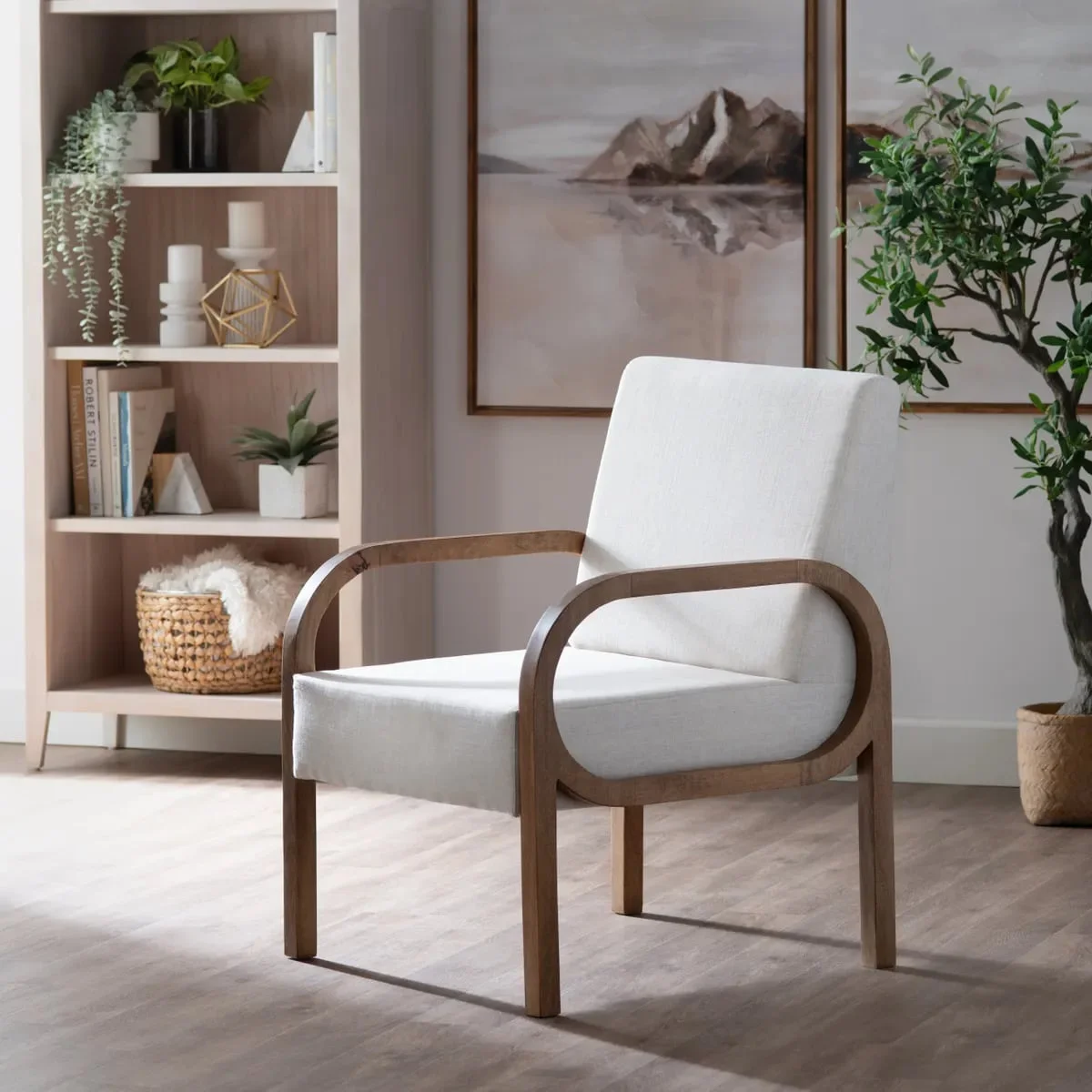 moreThe natural mango wood frame boasts a beautifully stained light brown finish, highlighting its striking texture and tonal depth. The curved silhouette adds a touch of organic softness, while the off-white linen upholstery exudes subtle elegance and timeless appeal. Make a warm and welcoming first impression with this stylish and functional accent piece.