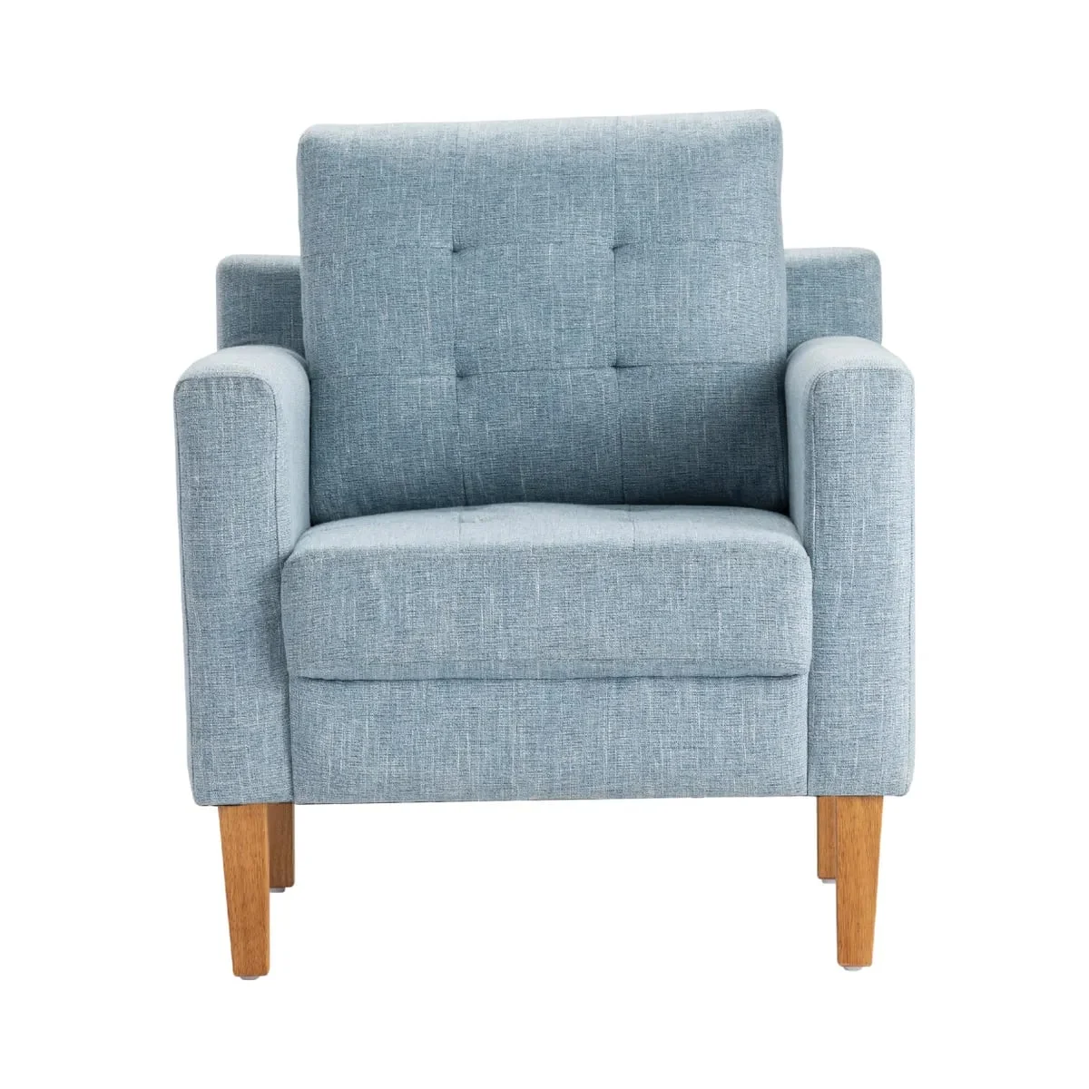moreThe blue fabric upholstered finish gives a midcentury modern feel while embracing a padded seat and back and low arm rests. With strong straight legs in a light brown rubberwood finish to complete the intergenerational look.