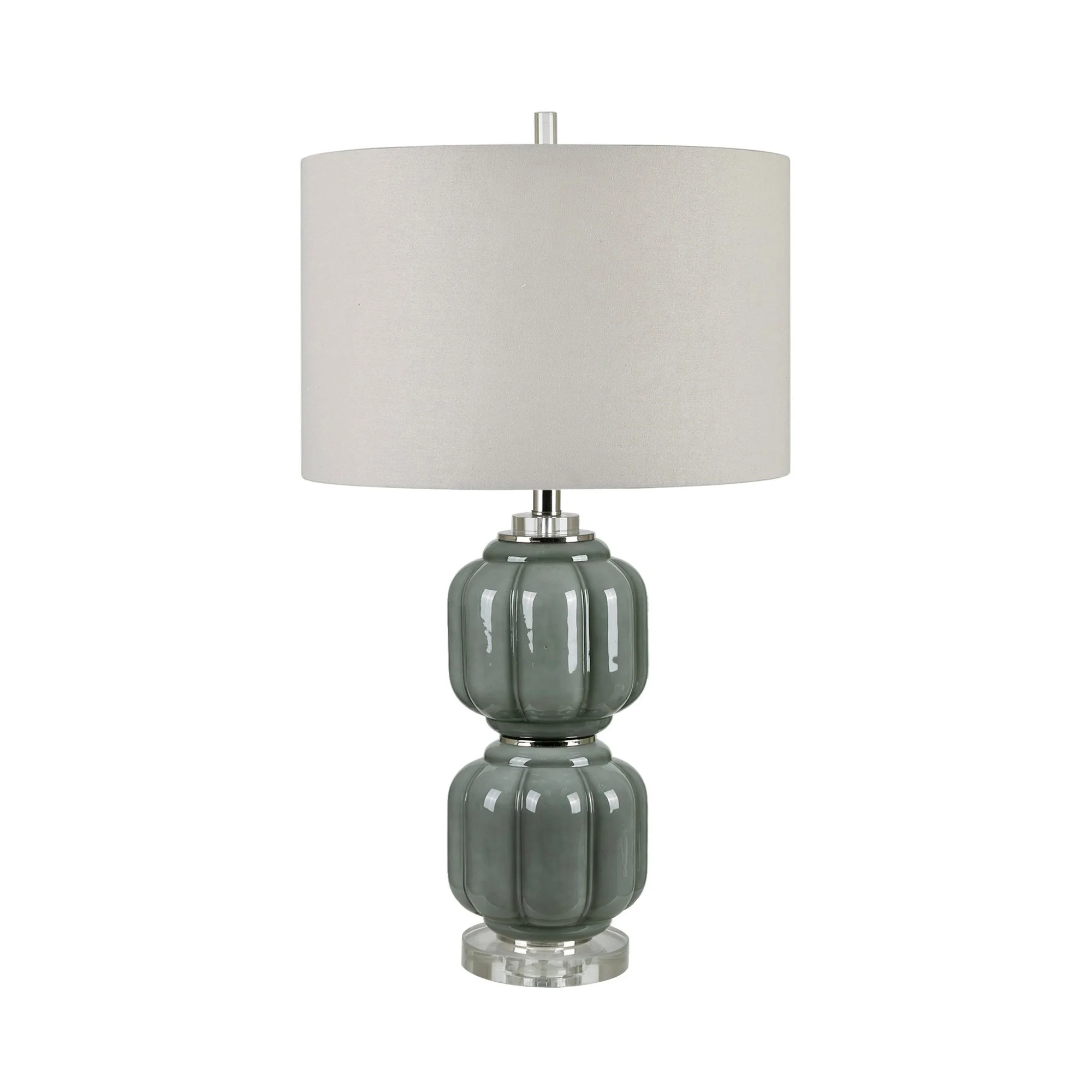 Transitional style featuring a drum-shaped shade with an oat-colored linen exterior and a polyester interior, Sleek, rounded grey glass body with crystal accents at the neck and base for an elegant look, Crystal cylinder finial that complements the lamp’s refined design, 3-way rotary switch for adjustable lighting, 6-foot clear plastic cord located at the base for easy placement and flexibility, Due to inconsistencies of various monitors, handheld devices, lighting, digital photography, and variances that occur naturally in materials, the color you see on your screen may vary slightly from the products received., Due to the various light bulb color temperatures (cool, daylight, smokey, amber, etc), there will be slight color variations in the lamp shade color., Does Not Apply