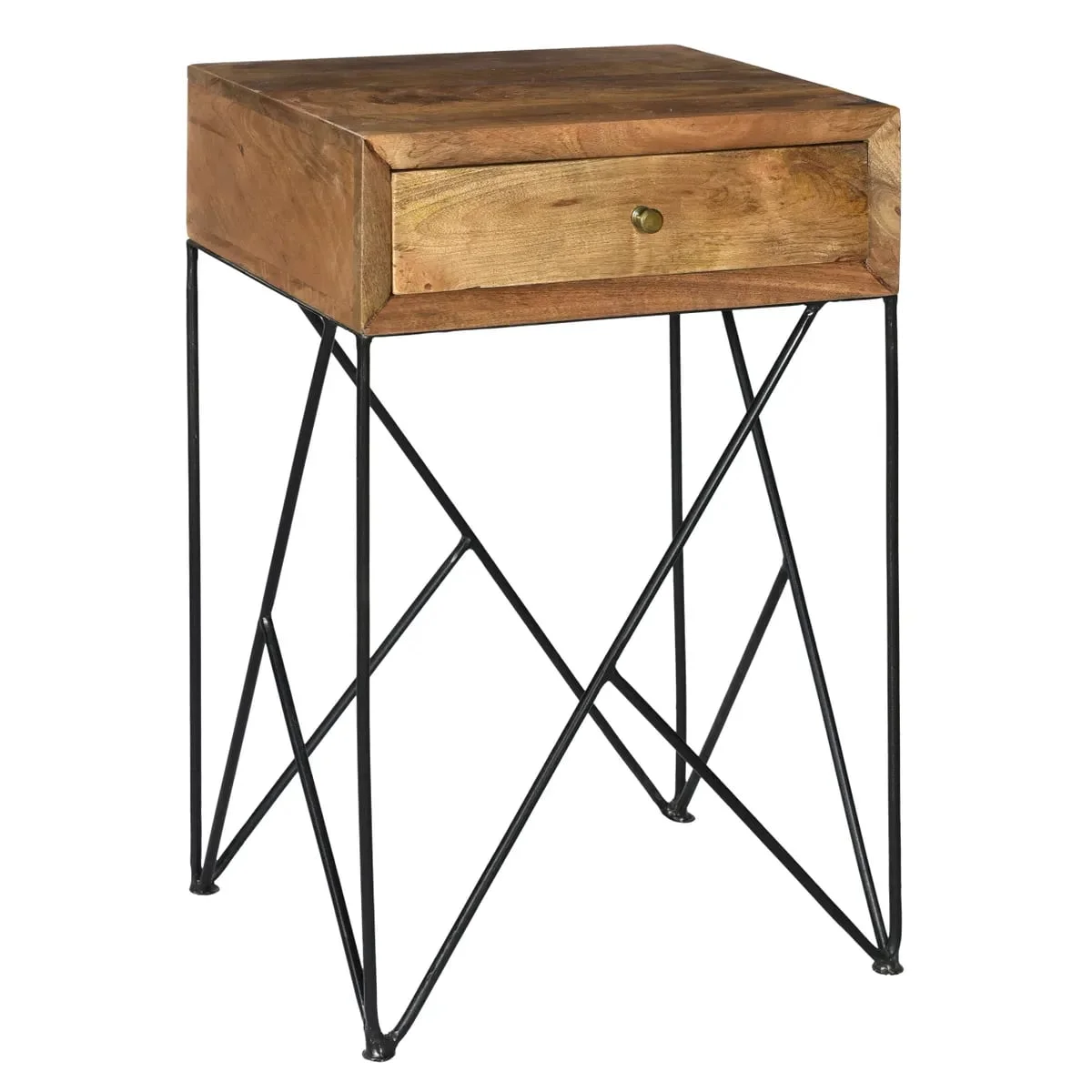 moreThis Accent Table has a honey brown finish on the boxed, single drawer top, with a gold tone pull, it will add warmth and beauty to your room. The multi-angled black welded metal rods form a sturdy base. This table is ideal for a bedside lamp and your favorite book, while the drawer holds items you want close to you during the night.