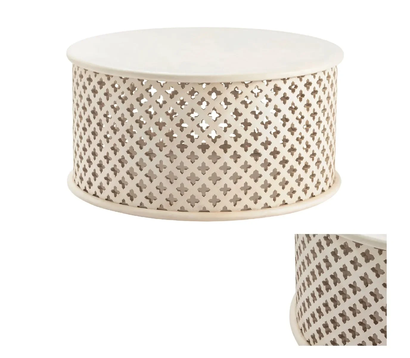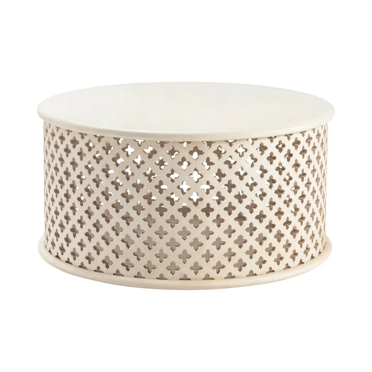 moreThe round table with hardwood and a white mango wood finish is perfect for setting down drinks, serving hors d'oeuvres, or displaying your favorite decorative items. The memorable, eye-catching cut-out detail winds around the tabletop and blends well with other home decor styles.