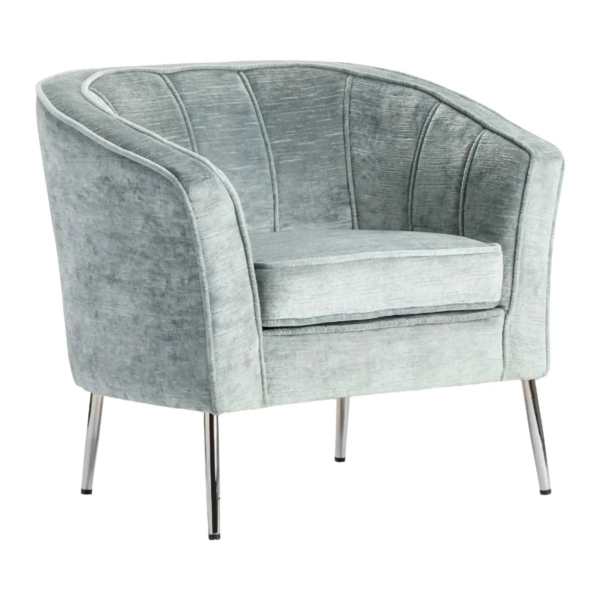 moreThe light gray velour upholstered finish gives a retro yet modern feel while encircling a padded seat and wraparound back and arm rests. Get ready to curl up with a book or journal. Silver polished metal finished legs seal the modern style with a bit of flare for stability.