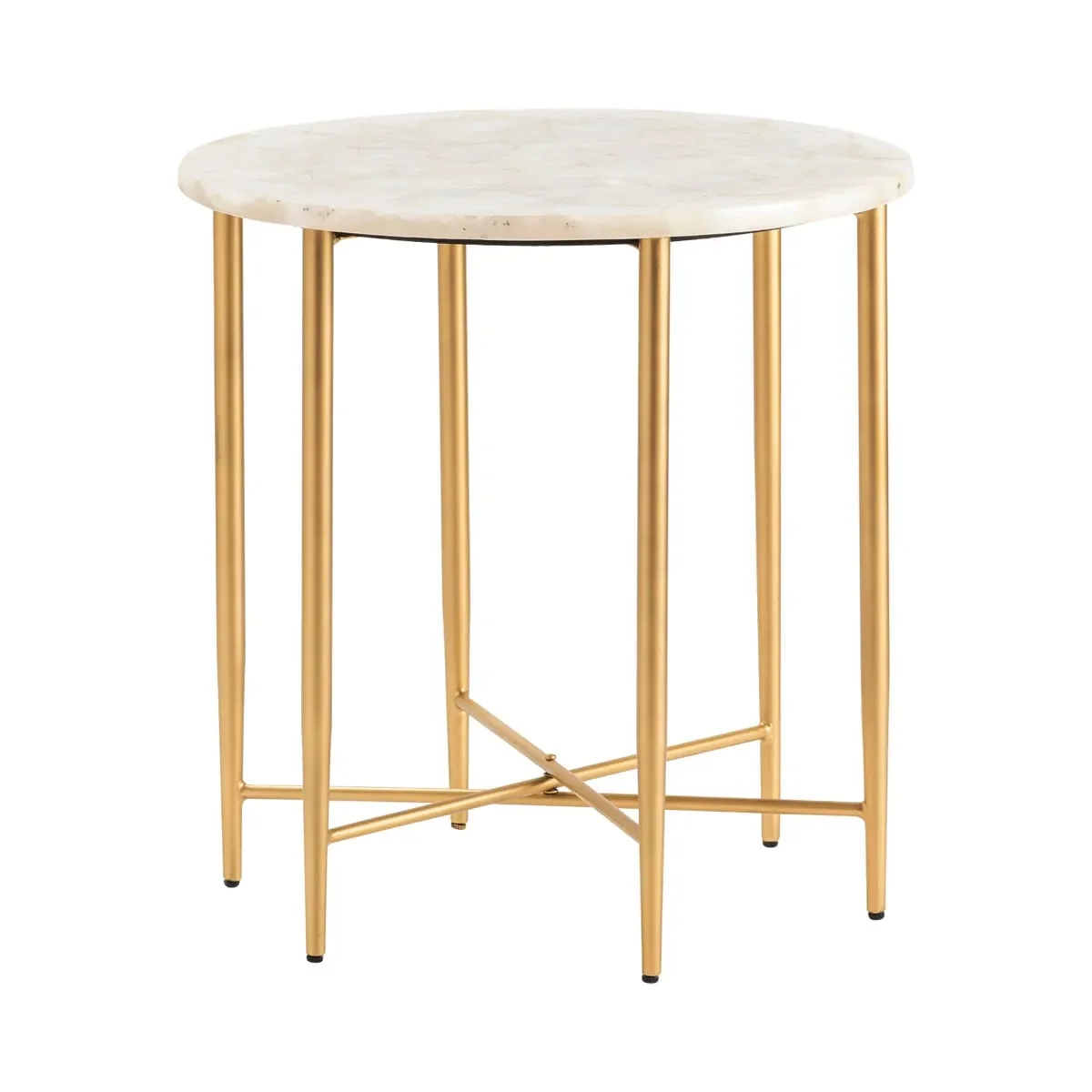 moreThis round, transitional accent table has six legs connected by an asterisk design in the middle. The gold finish of the metal legs complement the white marble table top that will beautifully support your favorite lamp or plant.