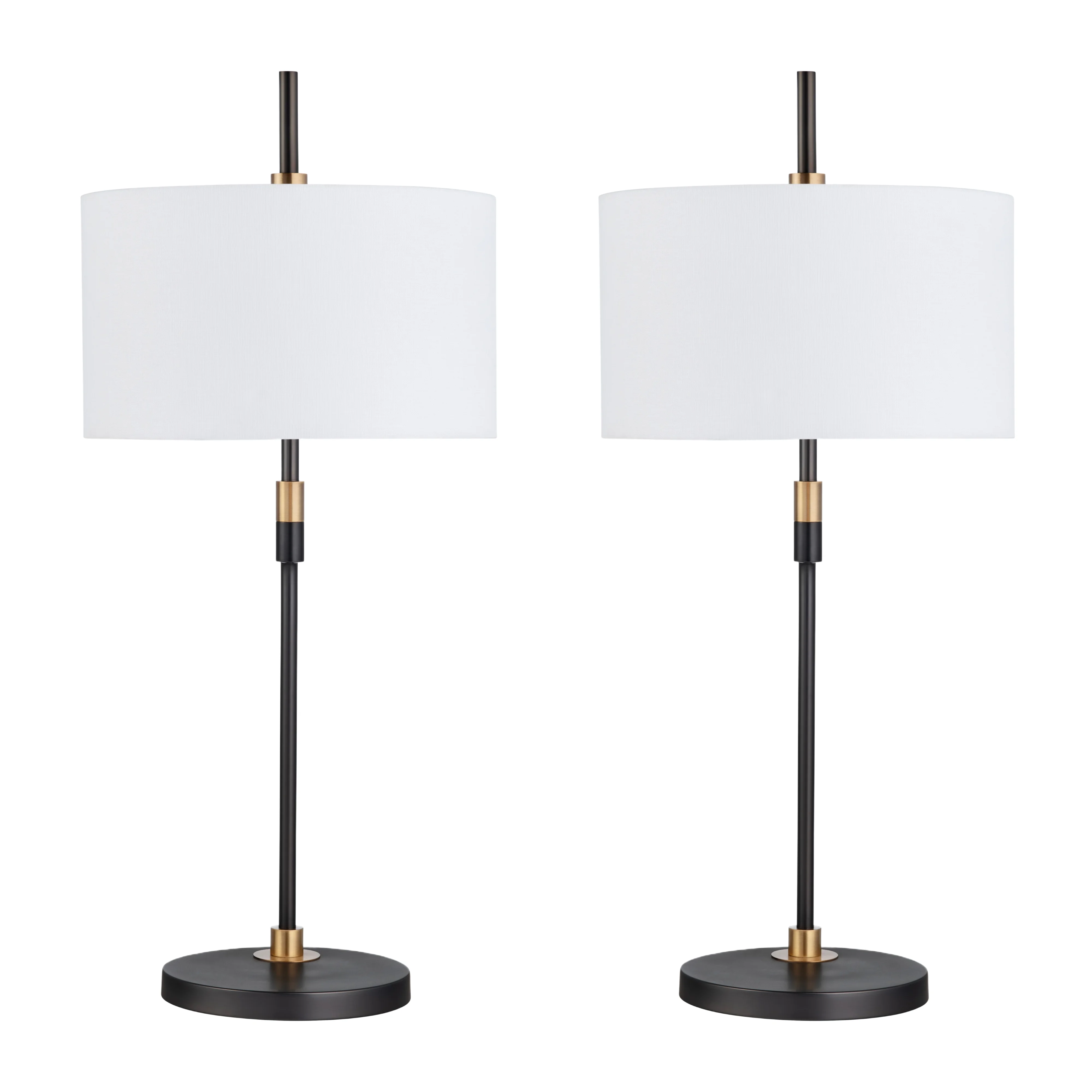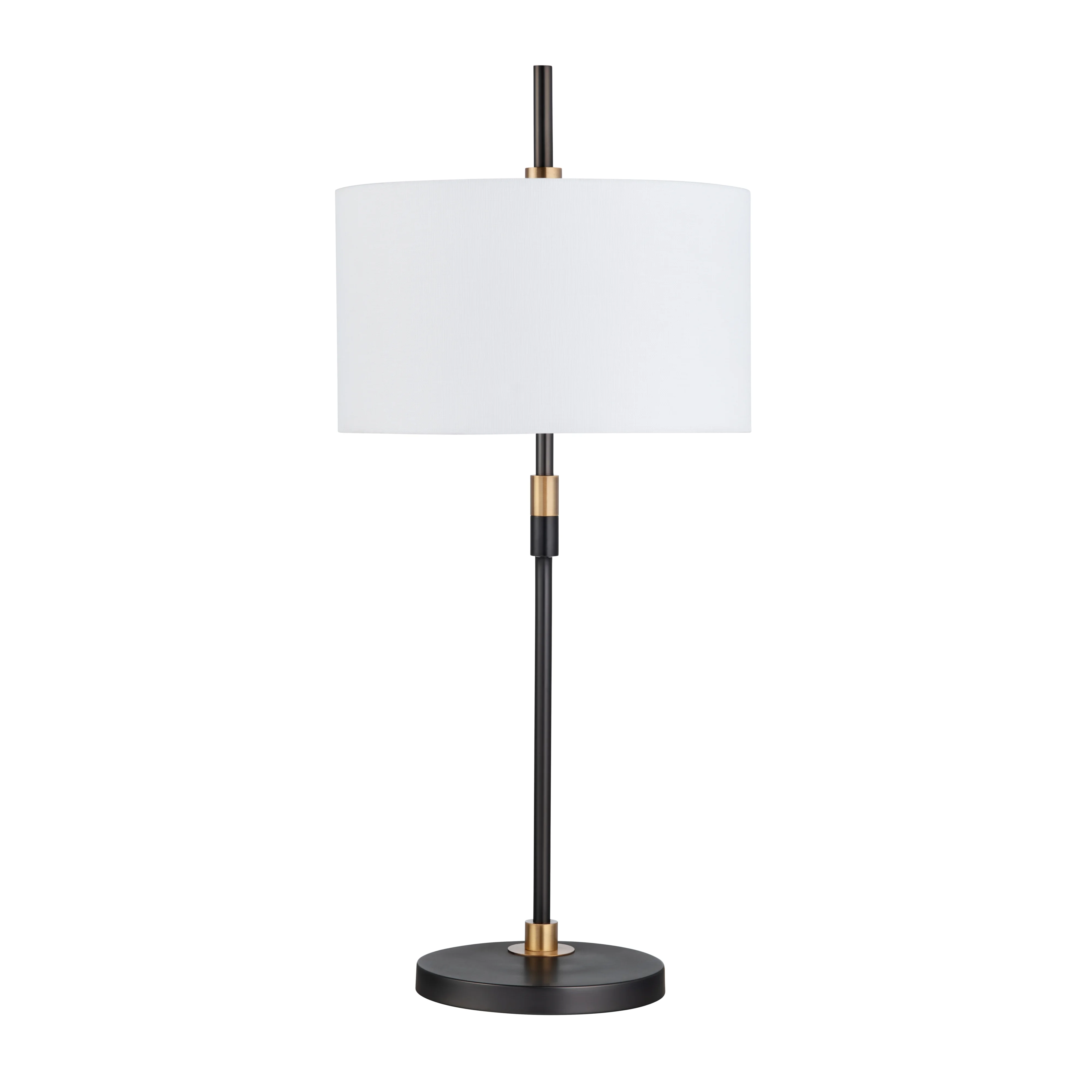 Features a sleek, curved metal body that blends contemporary style with functional elegance, Hardback drum shade made from linen with a polyester interior and a rolled edge for a polished finish, A horizontal arm suspends the shade, creating a visually balanced and dynamic silhouette, Gold detailing at connection points adds a striking contrast to the dark metal finish, Circular metal base ensures stability and complements the minimalist design, Due to inconsistencies of various monitors, handheld devices, lighting, digital photography, and variances that occur naturally in materials, the color you see on your screen may vary slightly from the products received., Due to the various light bulb color temperatures (cool, daylight, smokey, amber, etc), there will be slight color variations in the lamp shade color.