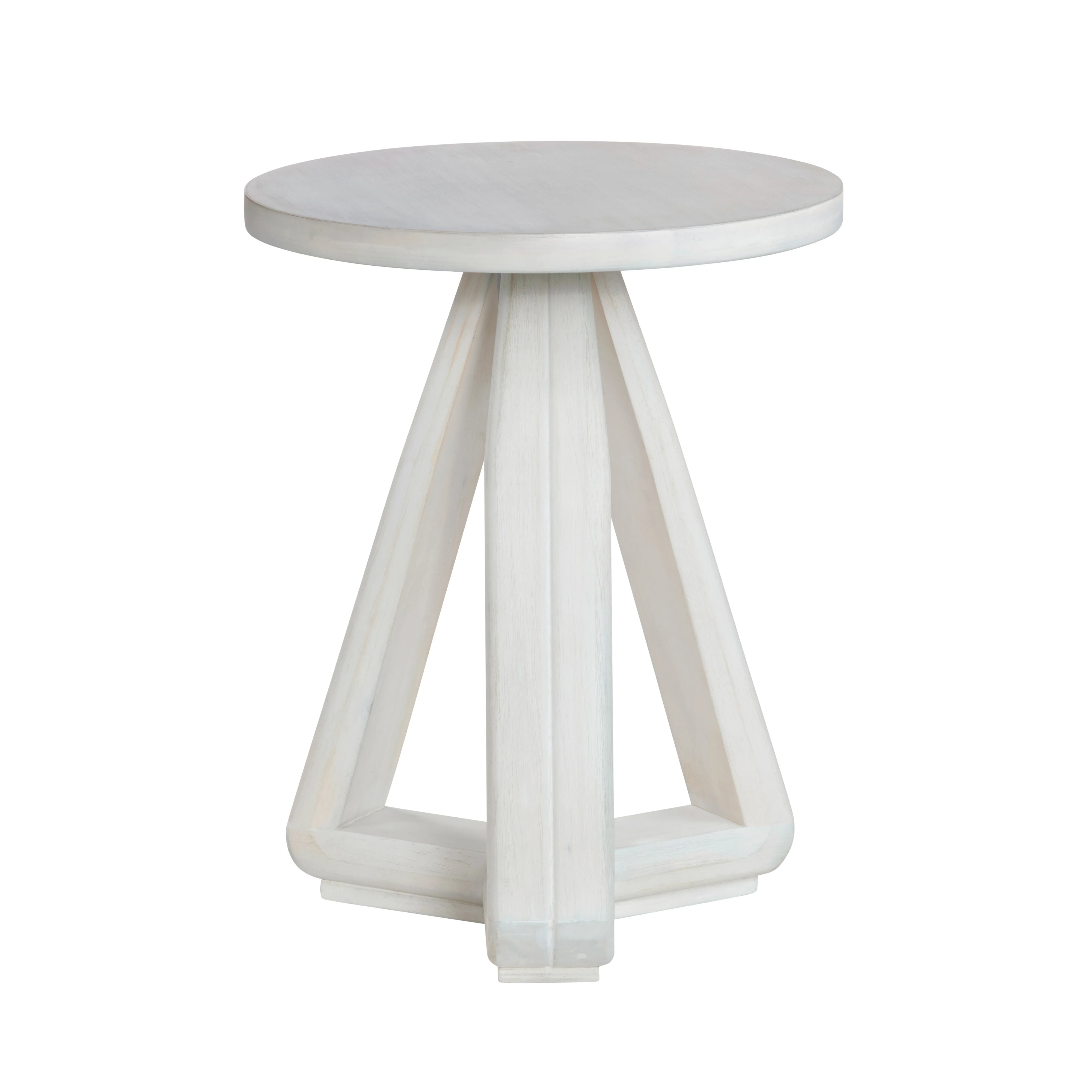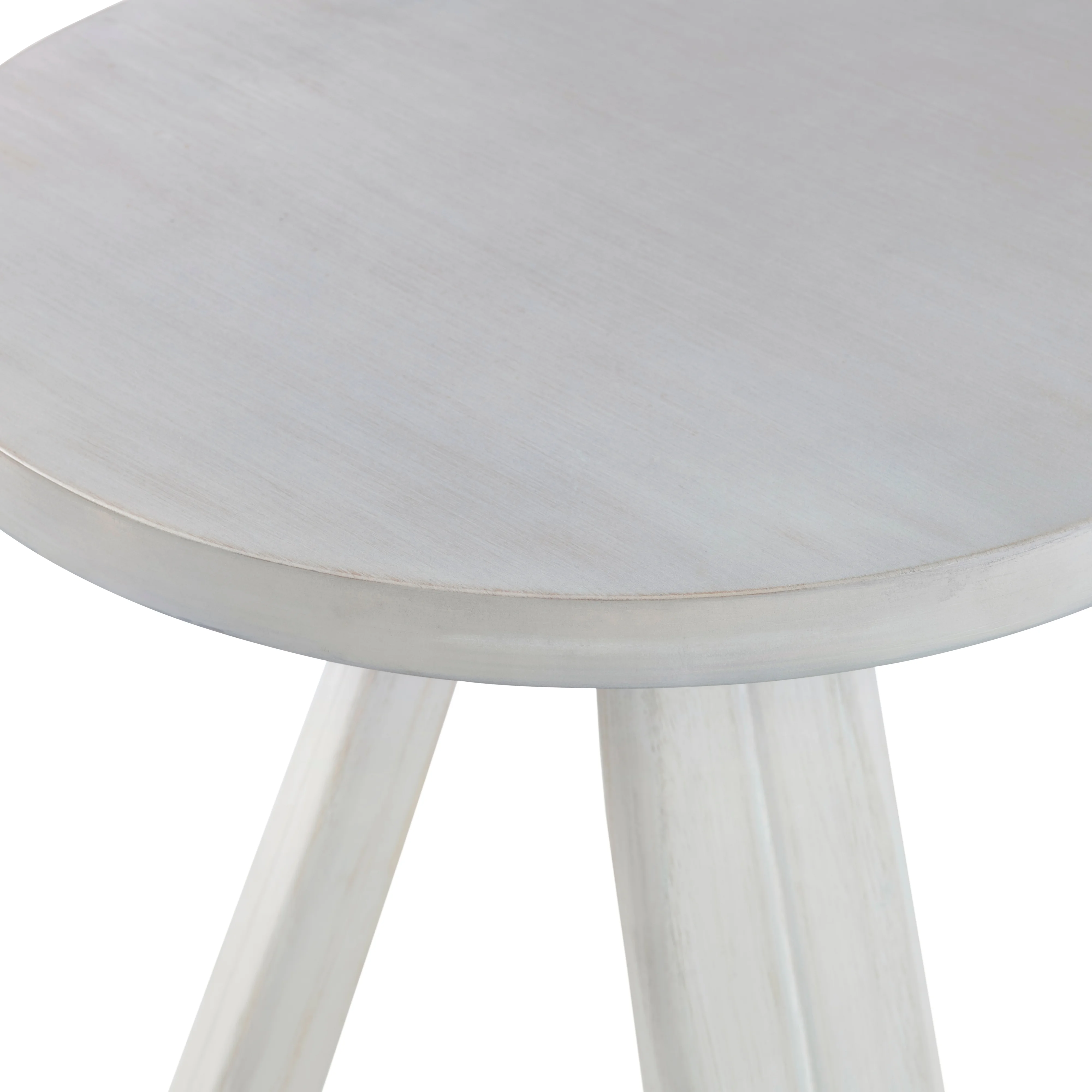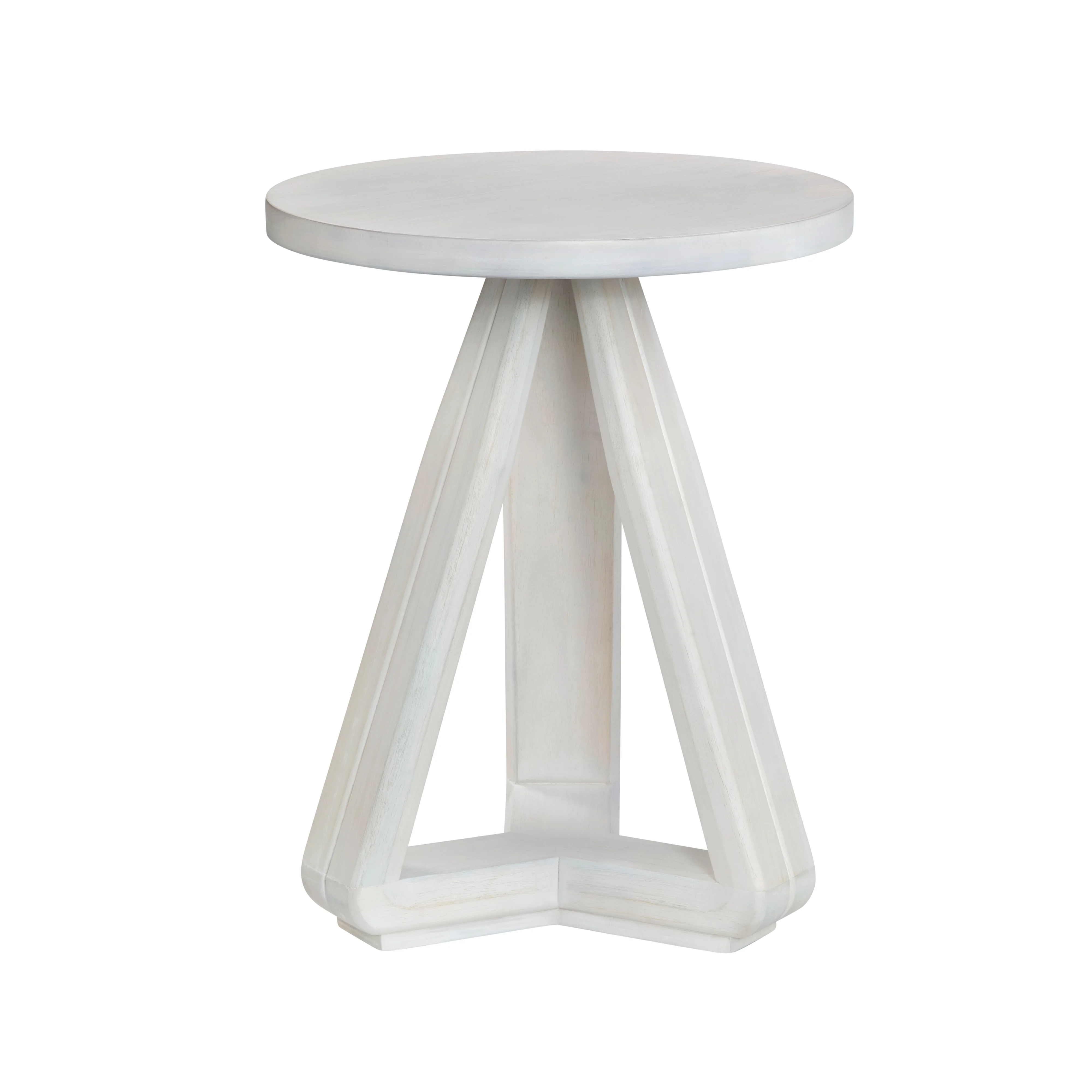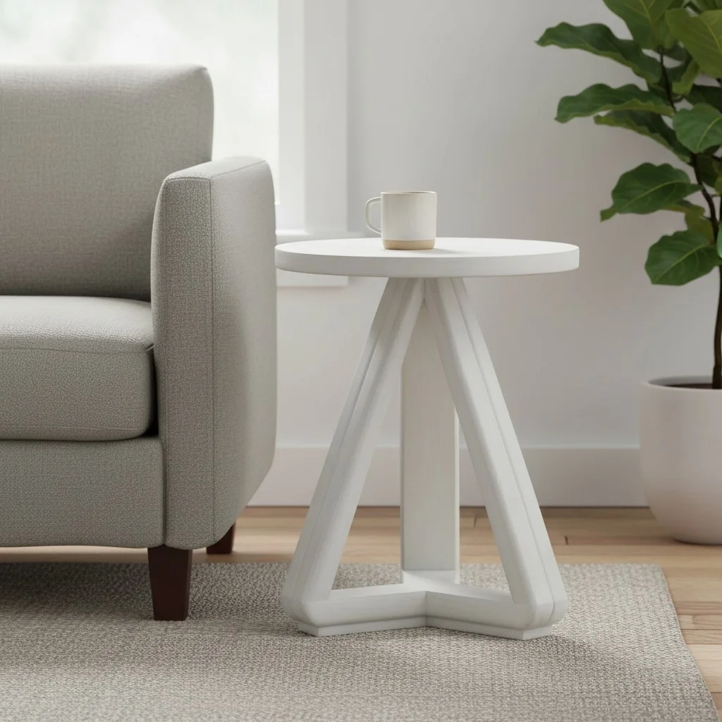 moreSculptural simplicity you can set a drink on. Three wedge-cut legs join at the base to form a stable tripod pedestal, lifting a 19-inch round top finished in a versatile matte chalk-white—perfect beside a sofa or as a plant stand.