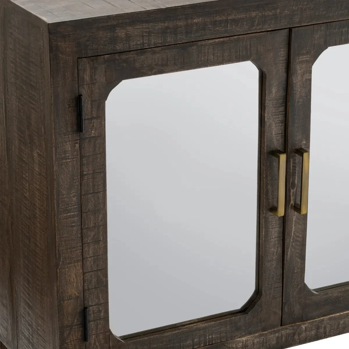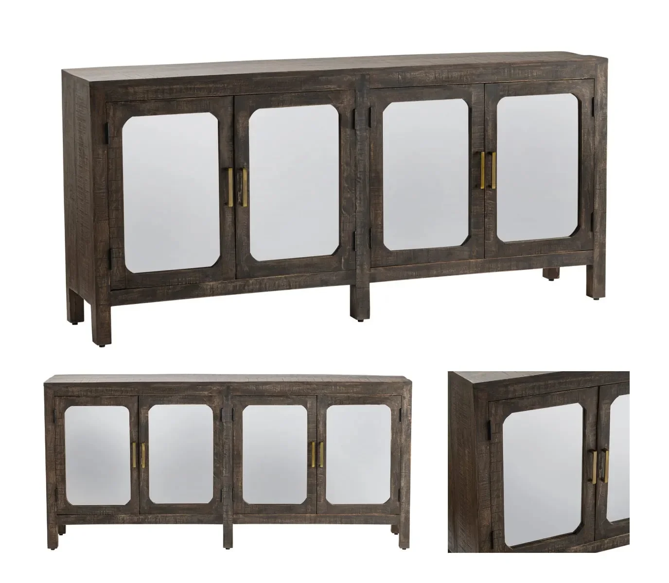 moreMade of wood, this sideboard has a dark gray finish. The four doors each have a mirror finish and open to reveal storage space. This sideboard has two cord management holes that give this piece versatility allowing it to be used as a media console. Tipping restraints are included.