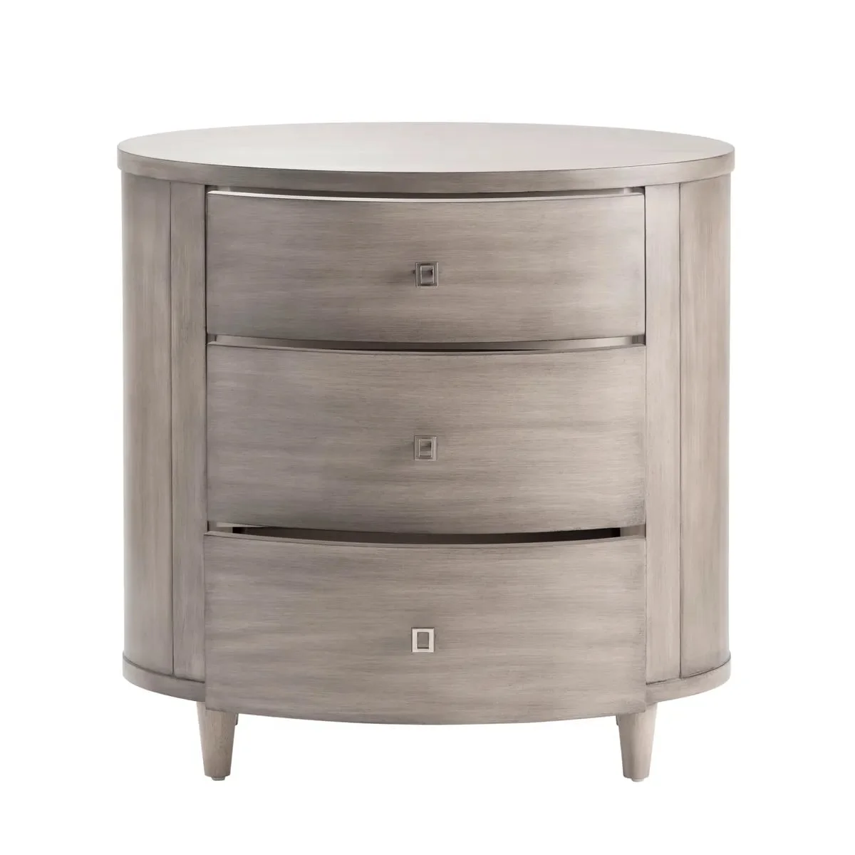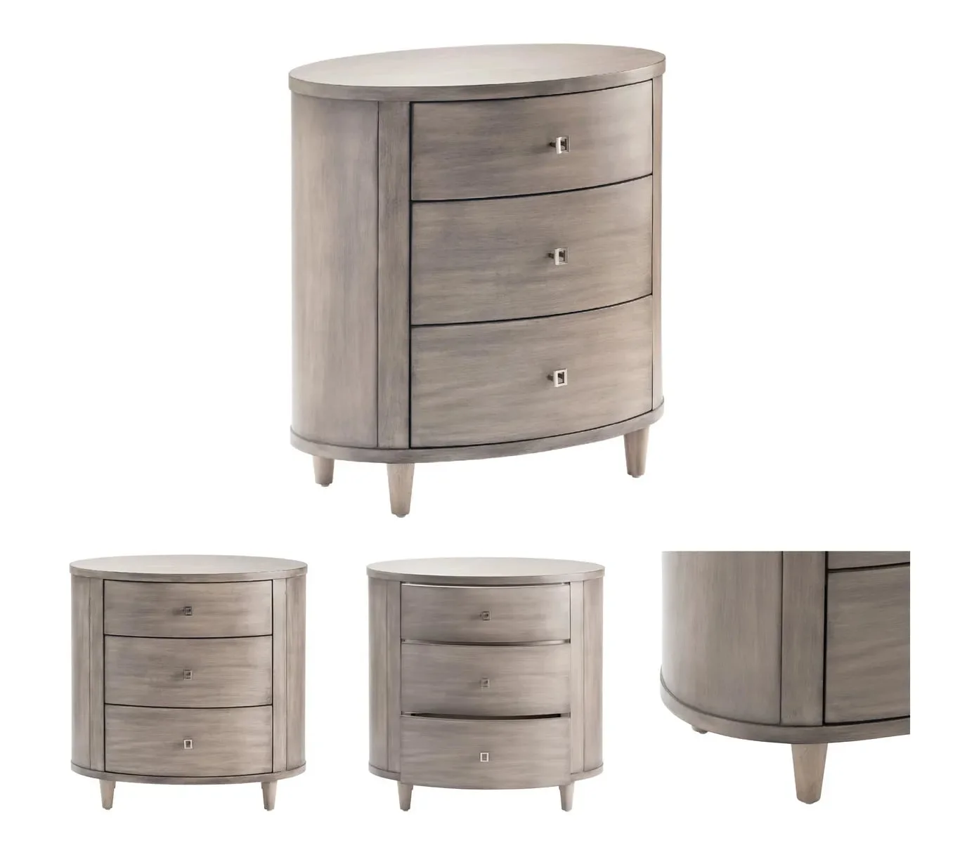 moreThree drawers are centered in the soft oval form of the piece, leading down to tapered legs for a stable and modern feel. Right at home at any cozy spot in your home, this piece is understated with soft appeal and contrasting square drawer-pulls.