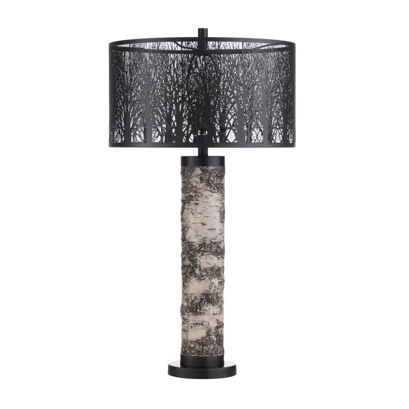 Textured resin and metal body with a natural, bark-like finish in brown tones, Accented with black metal at the base and neck for a bold, earthy contrast, Laser-cut black metal drum shade featuring a detailed forest silhouette, Standard socket with 3-way rotary switch; supports up to 150W bulb (not included, Clear 6-ft plastic cord exits discreetly from the base, Due to inconsistencies of various monitors, handheld devices, lighting, digital photography, and variances that occur naturally in materials, the color you see on your screen may vary slightly from the products received., Due to the various light bulb color temperatures (cool, daylight, smokey, amber, etc), there will be slight color variations in the lamp shade color., Does Not Apply