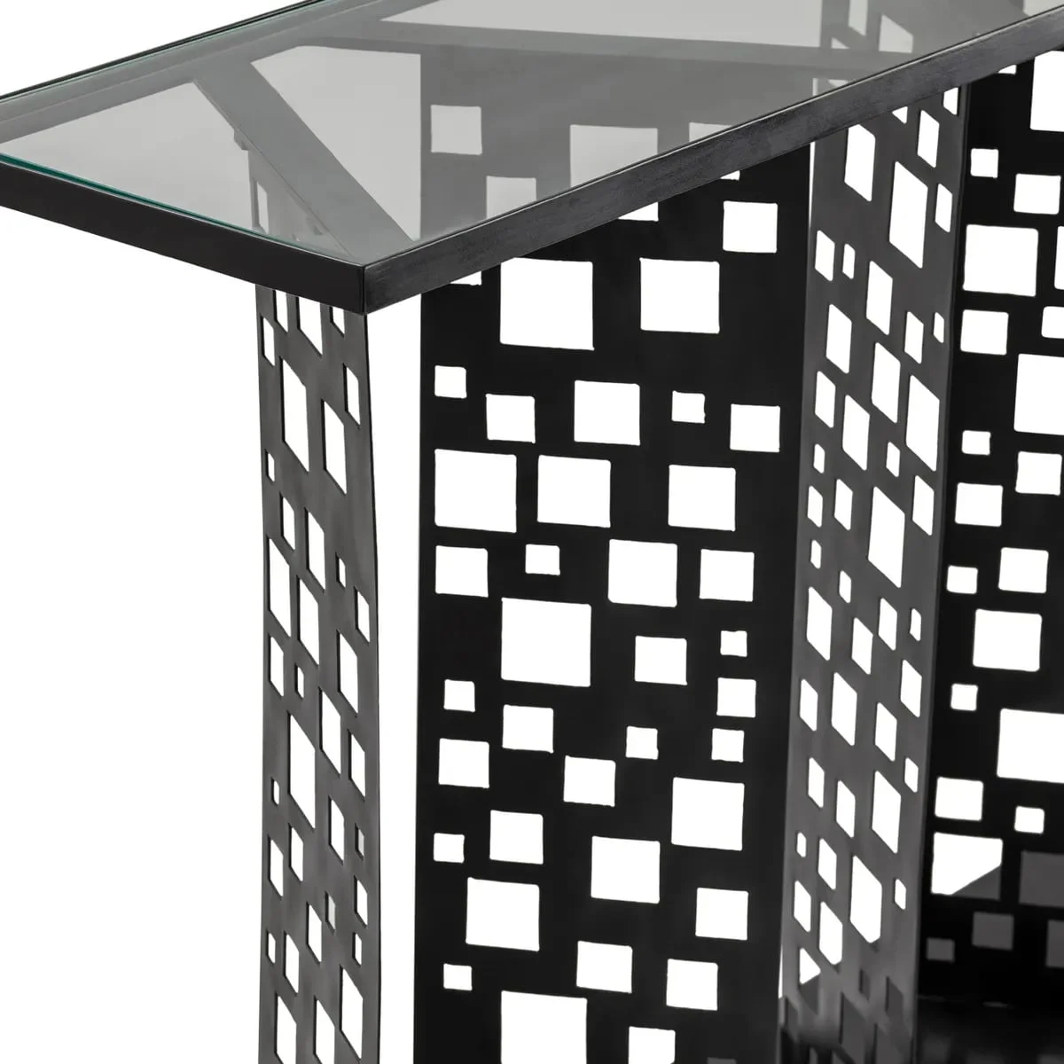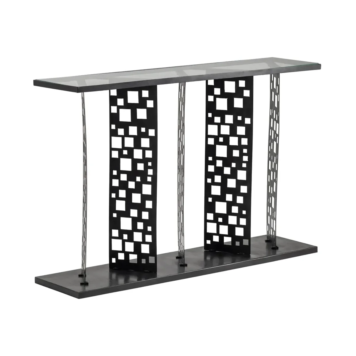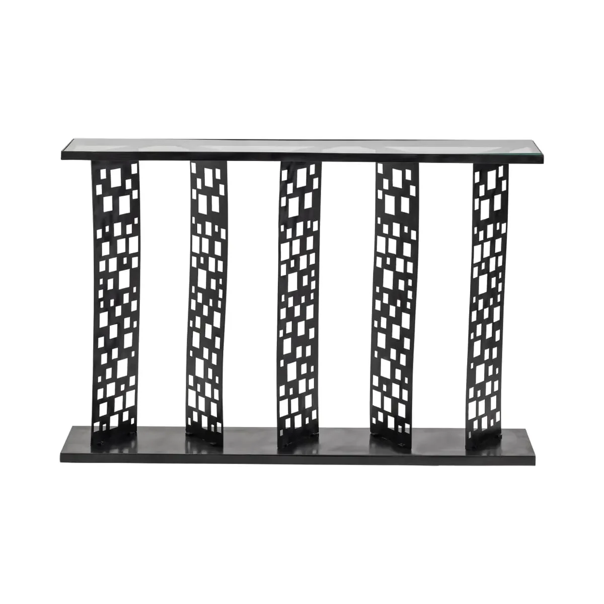 moreMade of black metal, this table has five pillars that feature cut out windows. The rectangular glass table top has a black frame around the edge to give it a bold look. The modern style of this table will bring a sense of sophistication to your home.