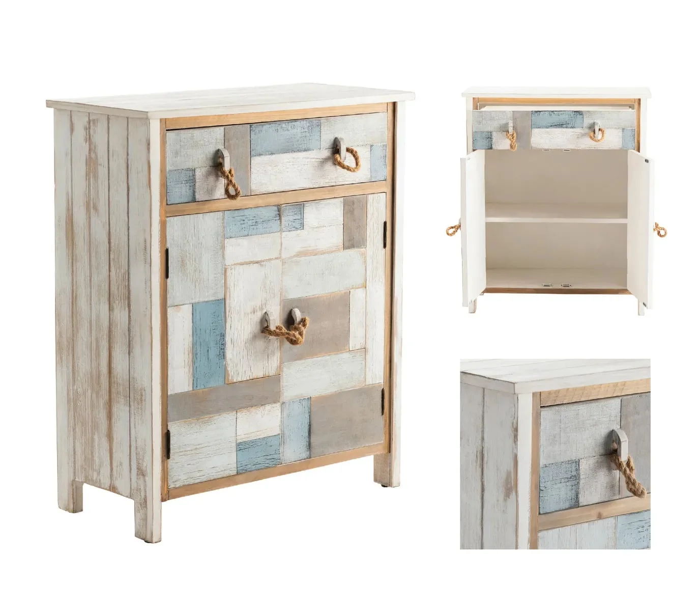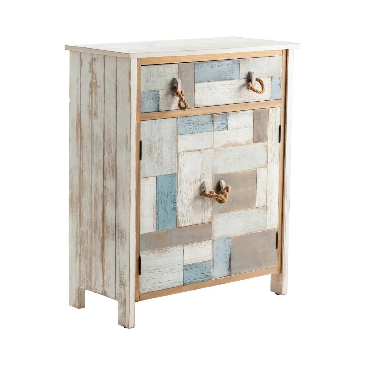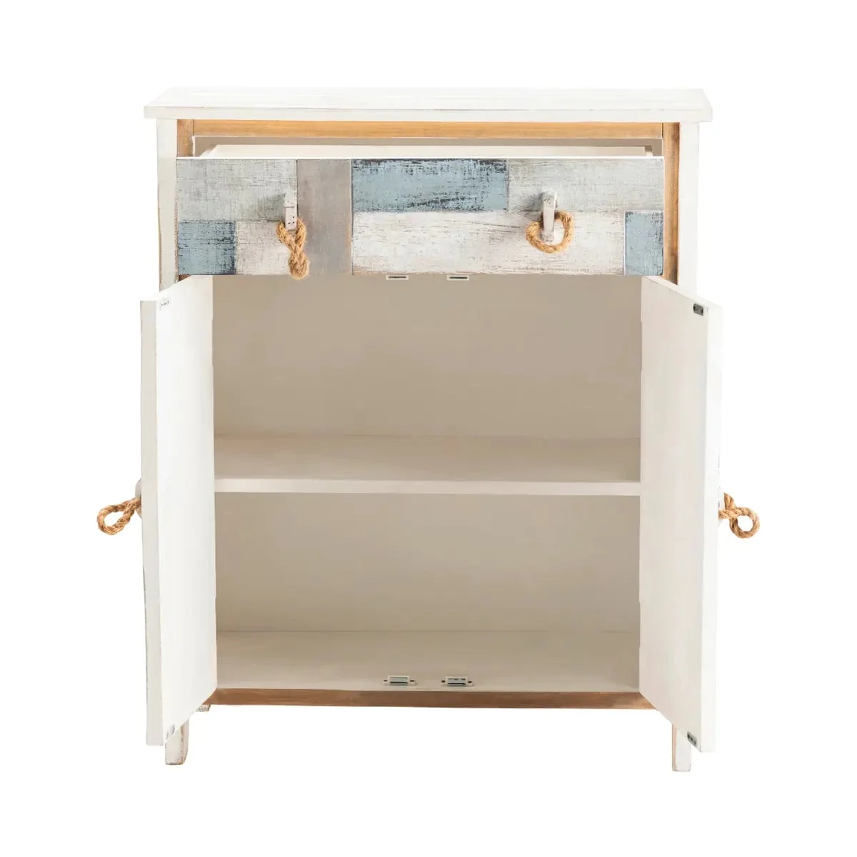 moreThis piece offers a white fir wood finish for a softness to the eye, and blue and multicolored fir wood cabinets and upper drawer for a splash of color. Rope detailing on the drawer and cabinet pulls feel right at home with a welcome coastal style that brings a cheery feel to any room you choose.