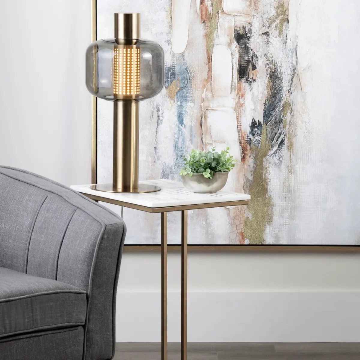 moreFramed from metal, this piece showcases a plated, brushed gold finish that gleams from every direction. The overall size allows for placement underneath your favorite accent chair or sectional for ease of access. Topping the design is a slab of natural white marble, embellished with a series of inlayed gold metal accents. The geometric design adds exquisite contrast against the white marble that gives way to a remarkable accent table like no other.