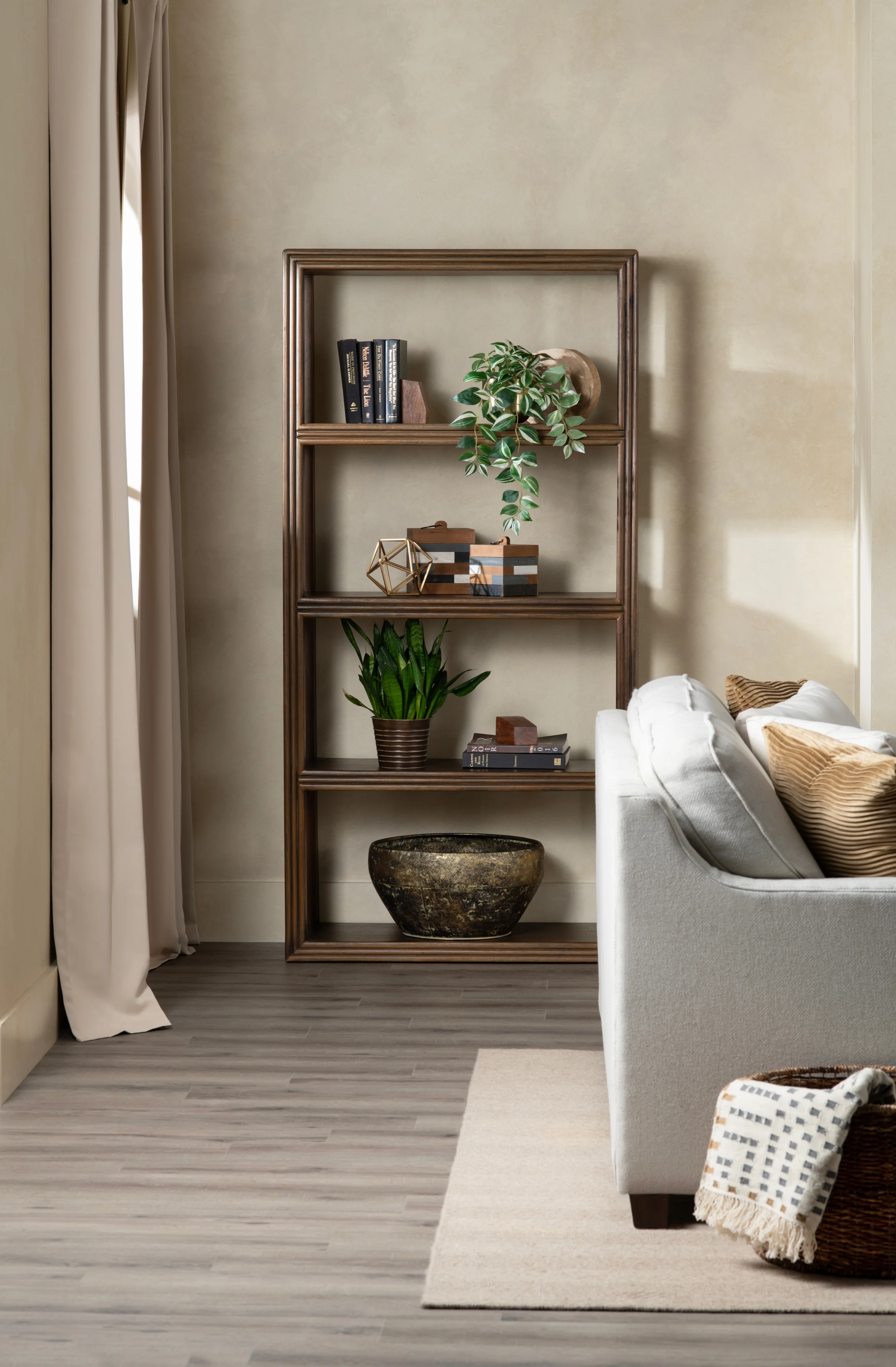 moreThis elegant 3-shelf etagere is crafted from solid mango wood, showcasing a warm walnut finish that highlights the natural grain depth. The dark wood tone adds a sense of sophistication to any room, making it perfect for a transitional design style.