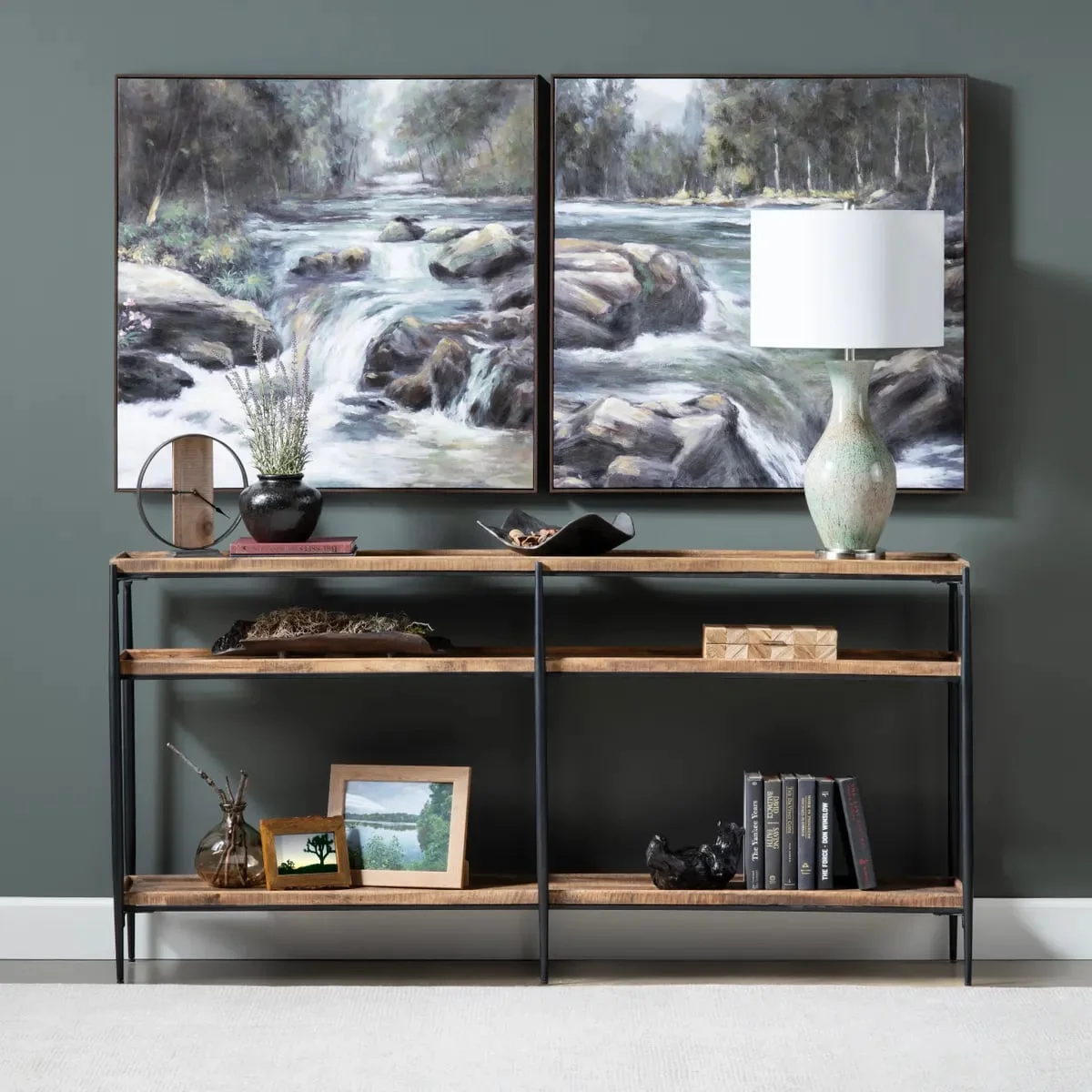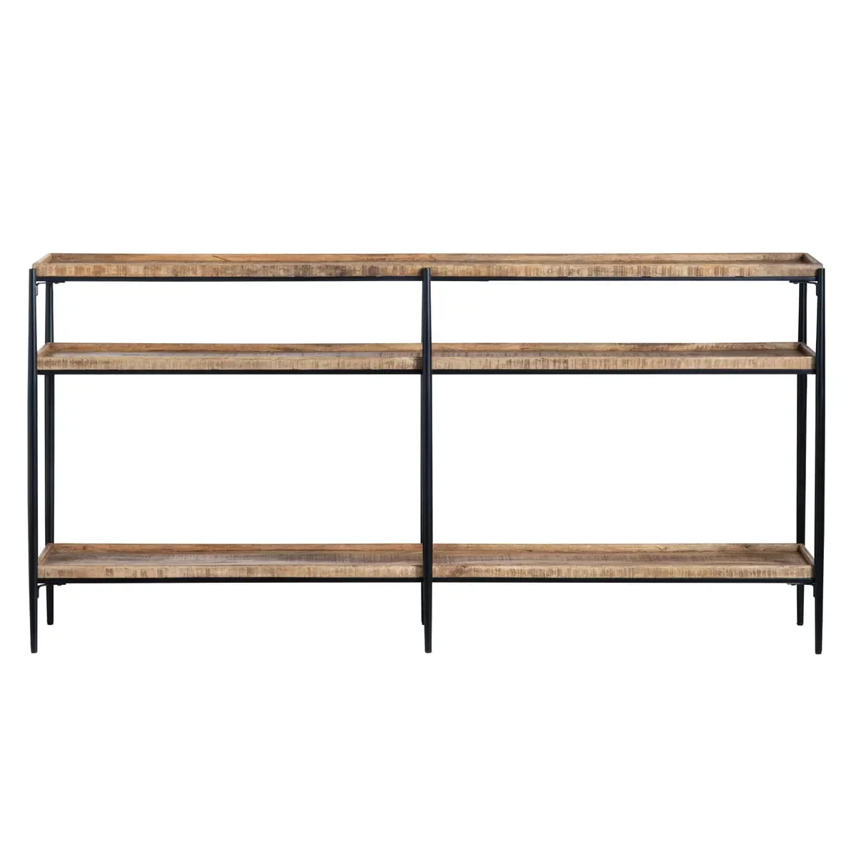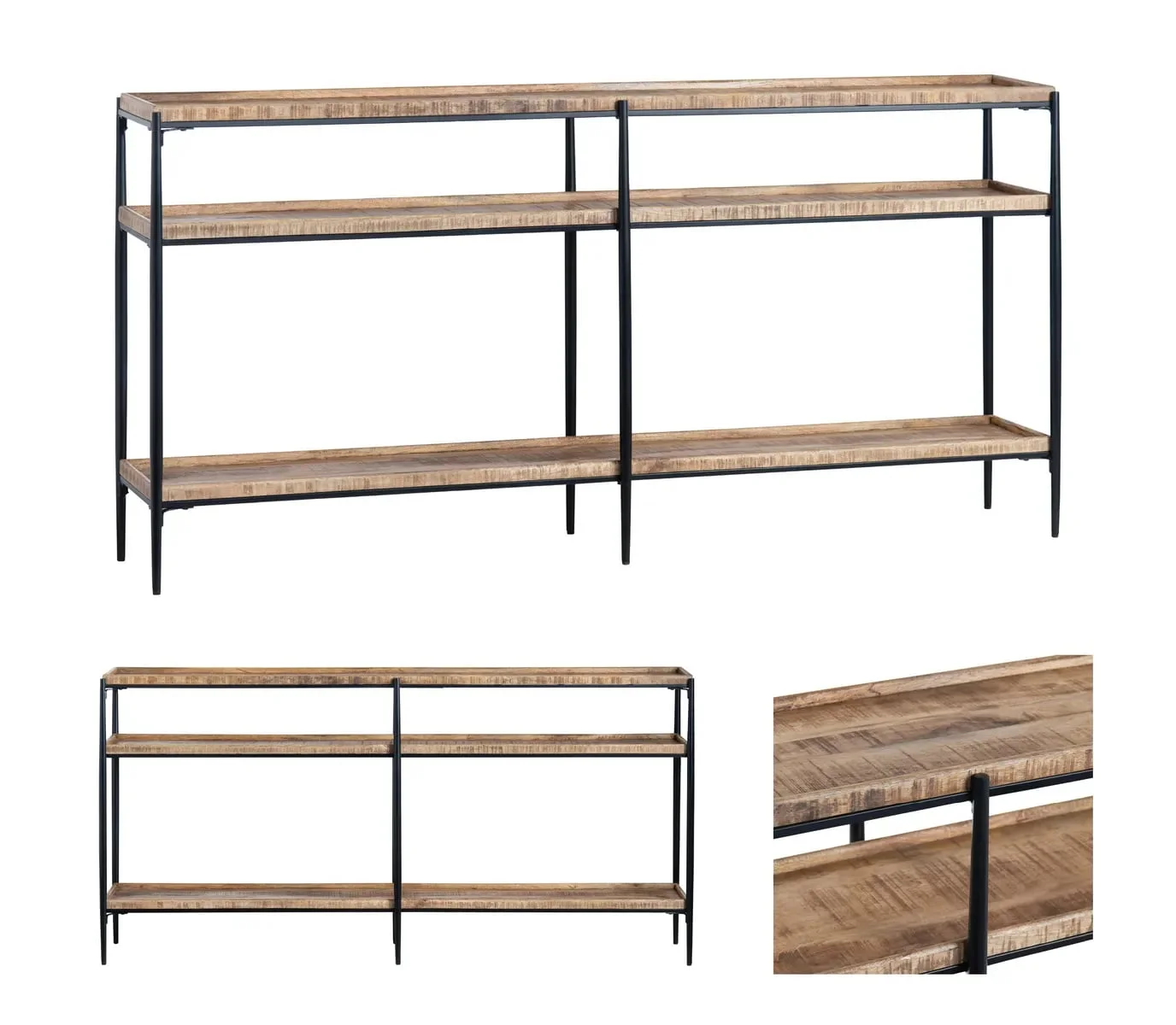 moreThis tiered design features a matte black, metal frame with three, full-length natural mango wood shelves. The earthy tones of the wood are on full display and coated with a clear varnish for added protection and durability. Open and airy, this console table is guaranteed to elevate your organic-modern or bohemian themed entryway, living room or dedicated entertaining space.