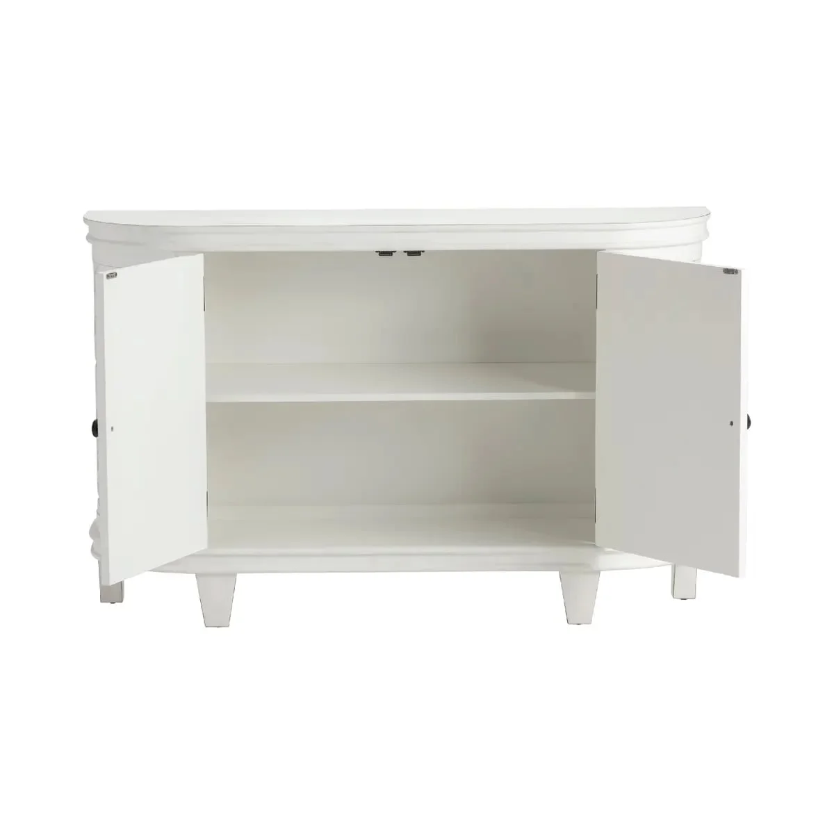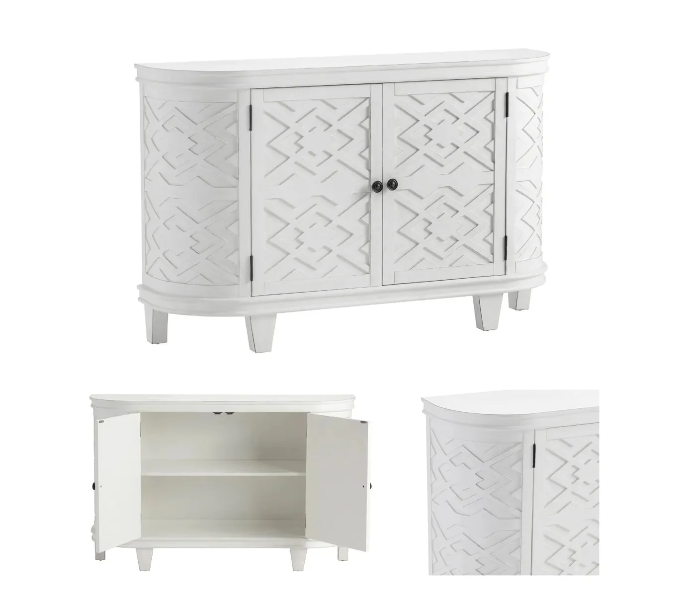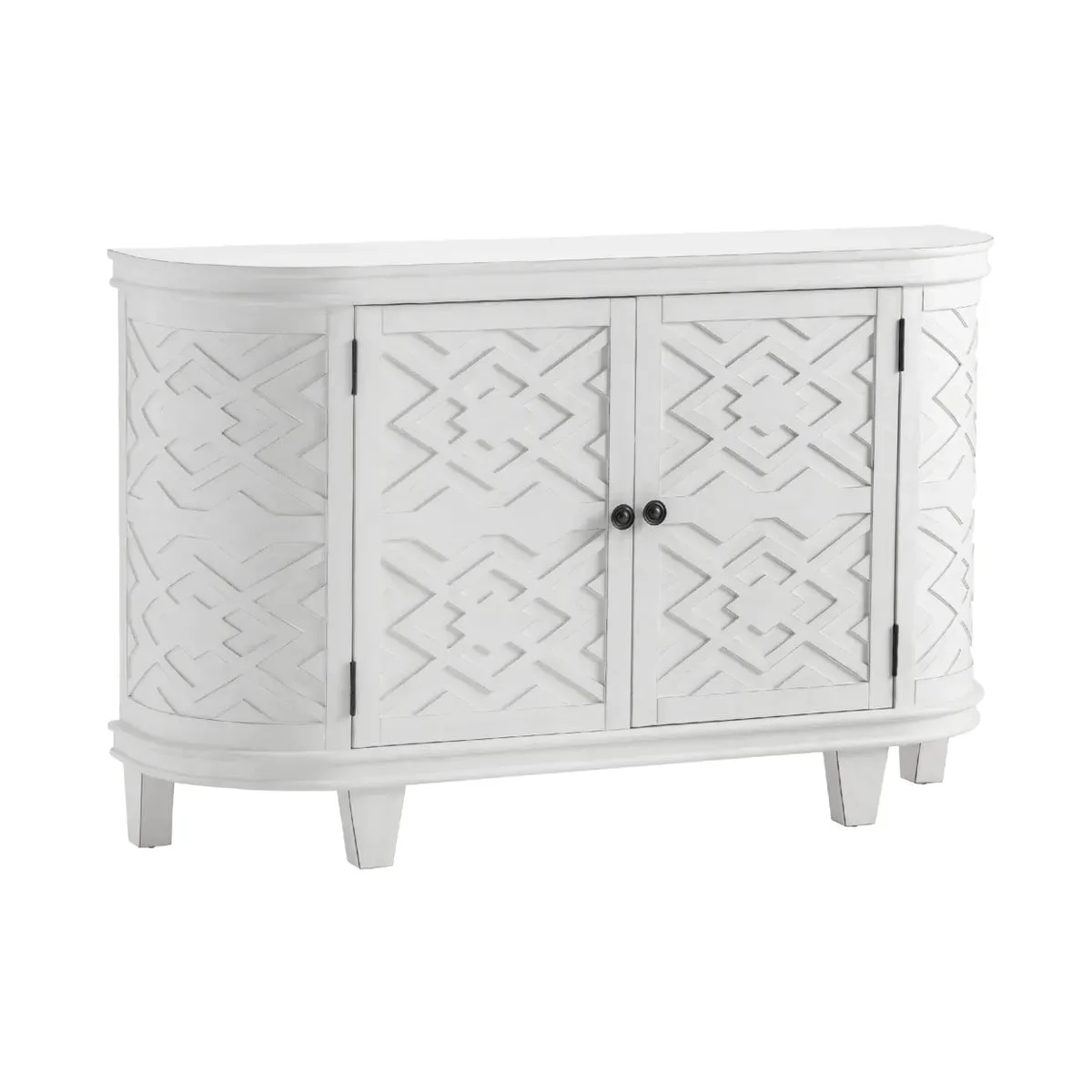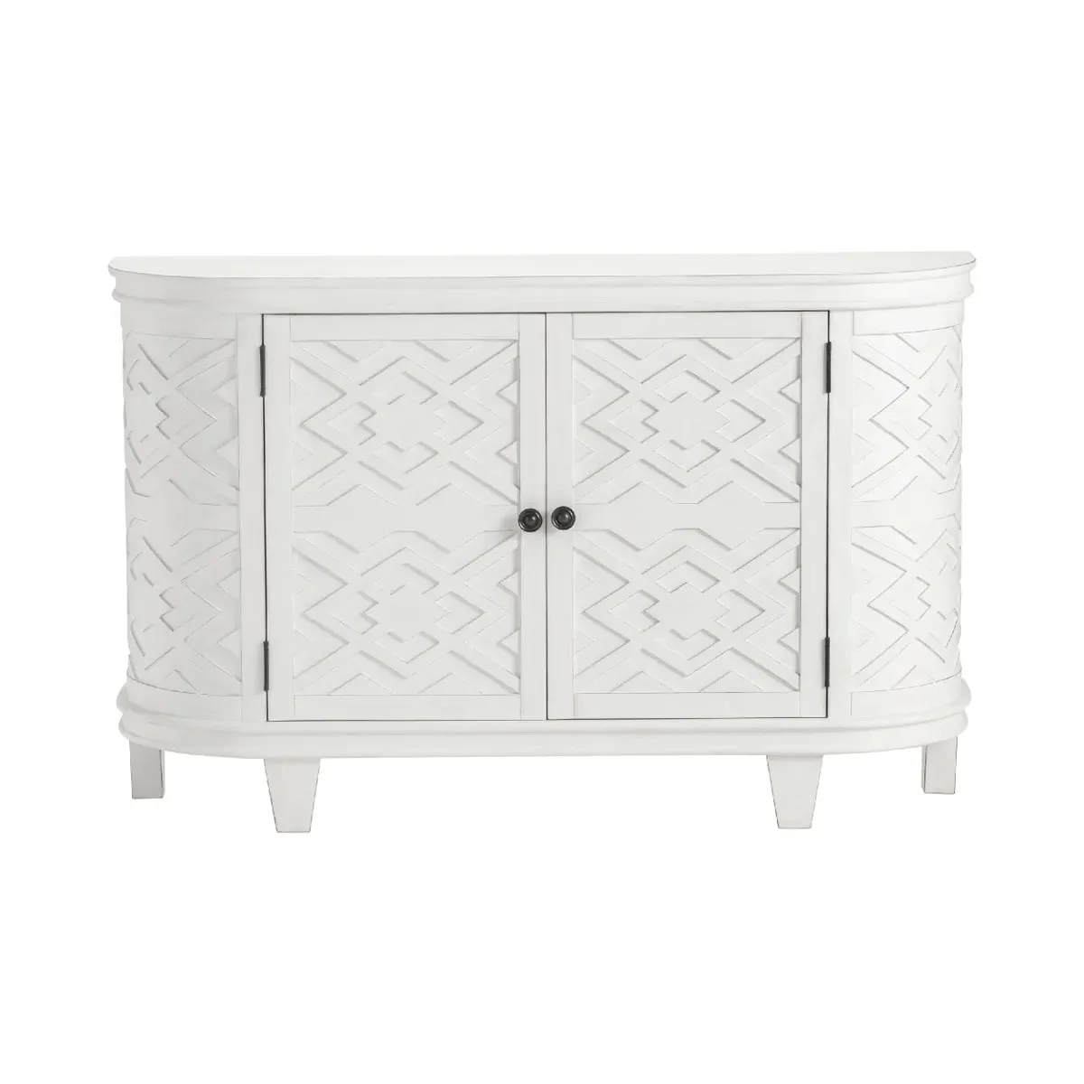 moreThis credenza is full of personality with a beachhouse brightness and angular subtle fretwood accents on the front cabinet doors and curved sides. Store anything behind those two cabinet doors on the two interior shelves.