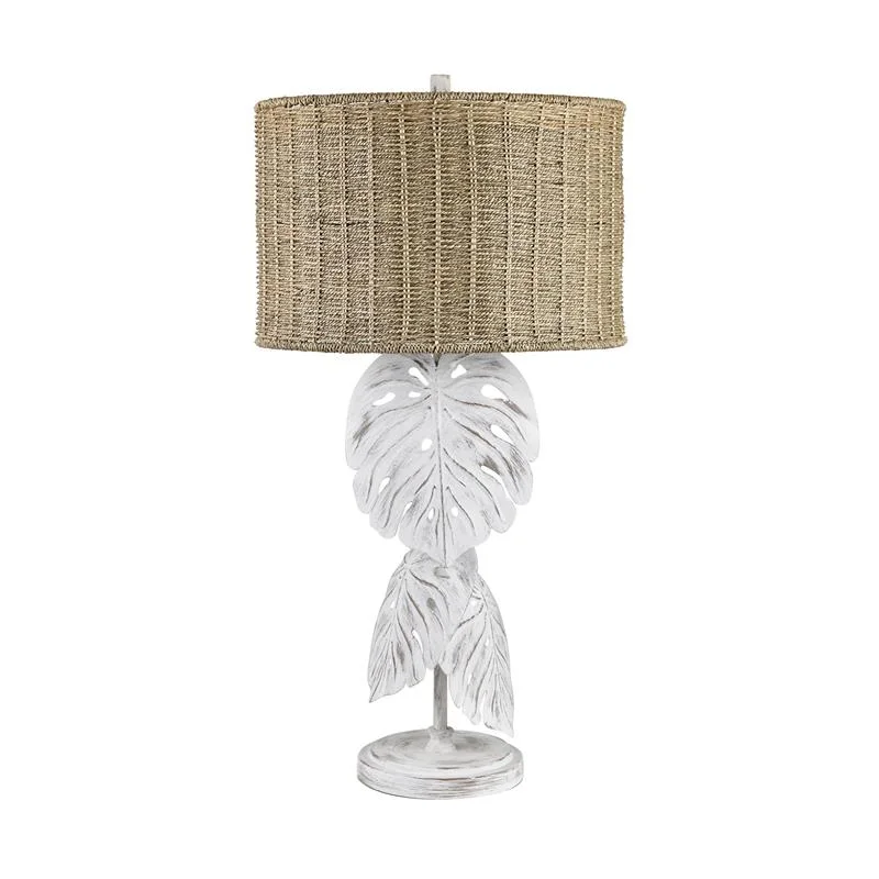 moreThis stylish table lamp blends natural textures with a modern aesthetic. The tan grass rope drum shade adds warmth and character, while the metal body, finished in distressed white, features a striking tropical leaf design, evoking a sense of nature and the outdoors. A coordinating cylinder finial mirrors the rustic charm of the lamp. The 3-way rotary socket offers versatile lighting, supporting a 150W bulb (not included). A 6-foot clear plastic cord is conveniently located at the base for easy placement