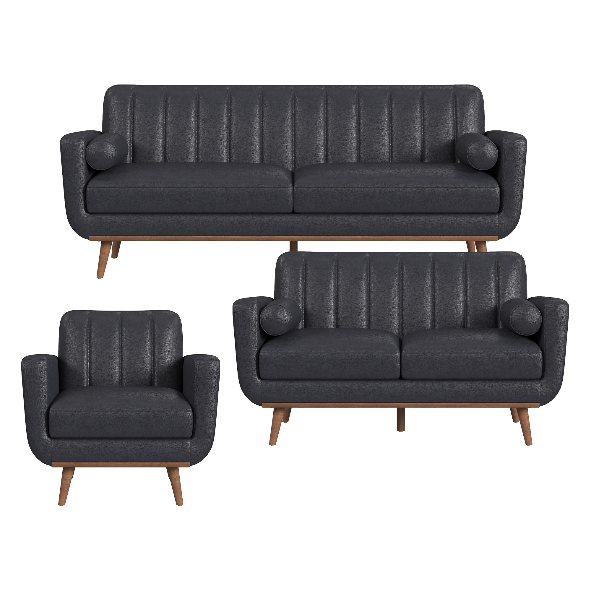 moreThis 3-piece living room set is the perfect addition to any contemporary home. With its mid-century modern design, it brings a touch of sophistication and elegance to your space. The set includes a sofa, loveseat, and chair, providing ample seating for 5-6 people, making it ideal for family gatherings or social events.