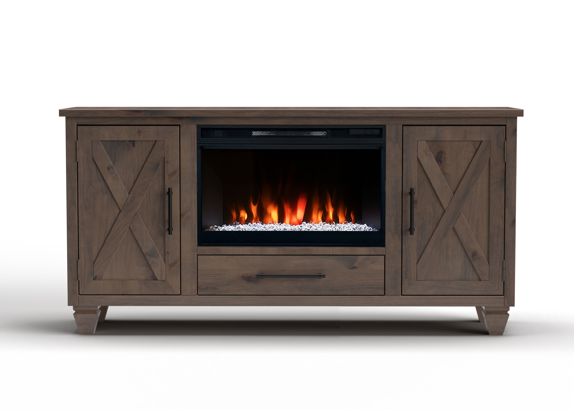 moreBring warmth and coziness to your living room with this charming 64" fireplace TV stand, perfect for a farmhouse-inspired decor. Made from high-quality Knotty Alder solids and veneers, this sturdy piece is built to last and features a beautiful Barnwood finish.