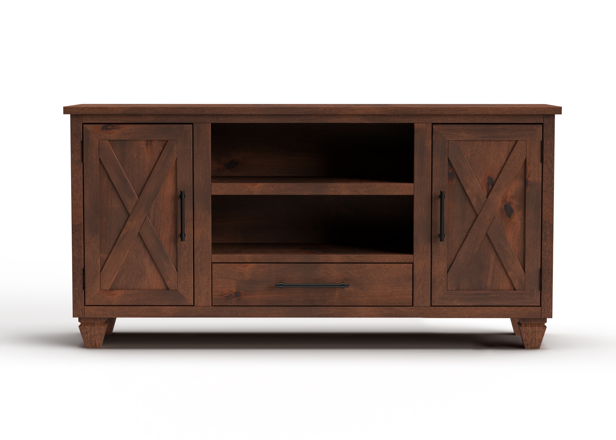 moreThis charming TV stand is designed to bring a touch of farmhouse charm to your living room. Made from high-quality Knotty Alder solids and veneers, it features a beautiful Dark Whiskey finish that adds warmth and character to any space. The Dark Bronze hardware complements the finish perfectly, creating a cohesive and stylish look.