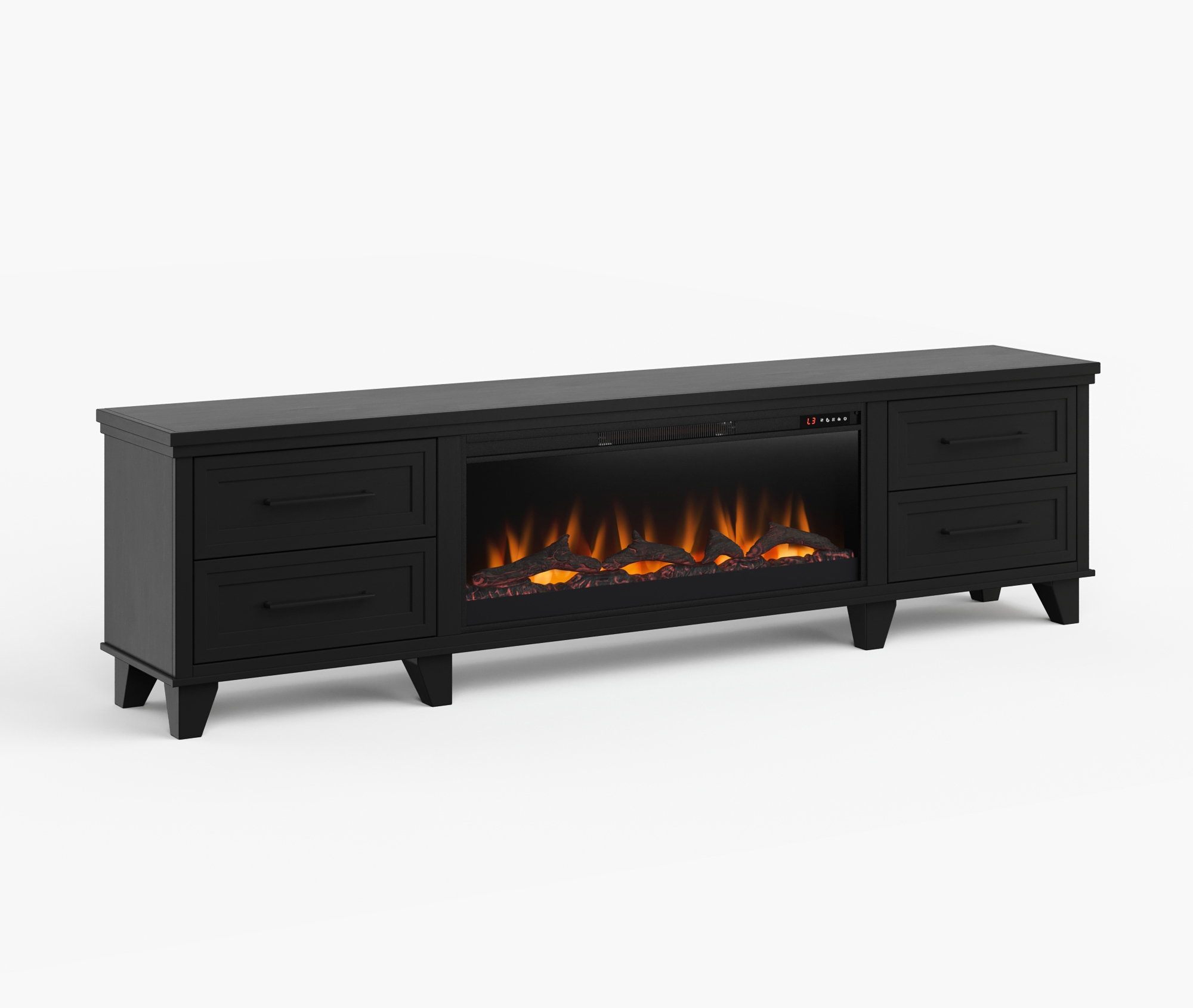 moreThis stunning 97" fireplace TV stand is the perfect addition to any living room, blending style and functionality in a beautiful transitional design. Made in the USA from high-quality wood, this piece is built to last and features a classic black finish that will complement any decor.