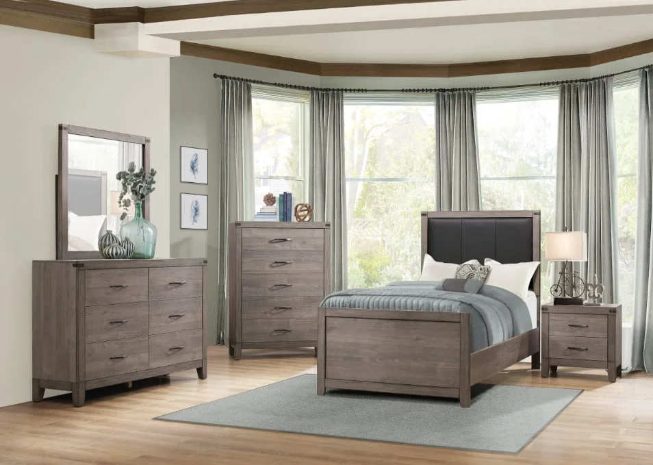 Industrial design is subtly used to achieve a cool look for your bedroom in the Woodrow Collection. Dark metal hardware and corner banding with rivet look lend to the casual look of this bedroom group. Melamine laminate features a weathered-wood look that furthers the intended design. Black faux leather accents of the headboard provides distinct complementing contrast to the finish of the collection.