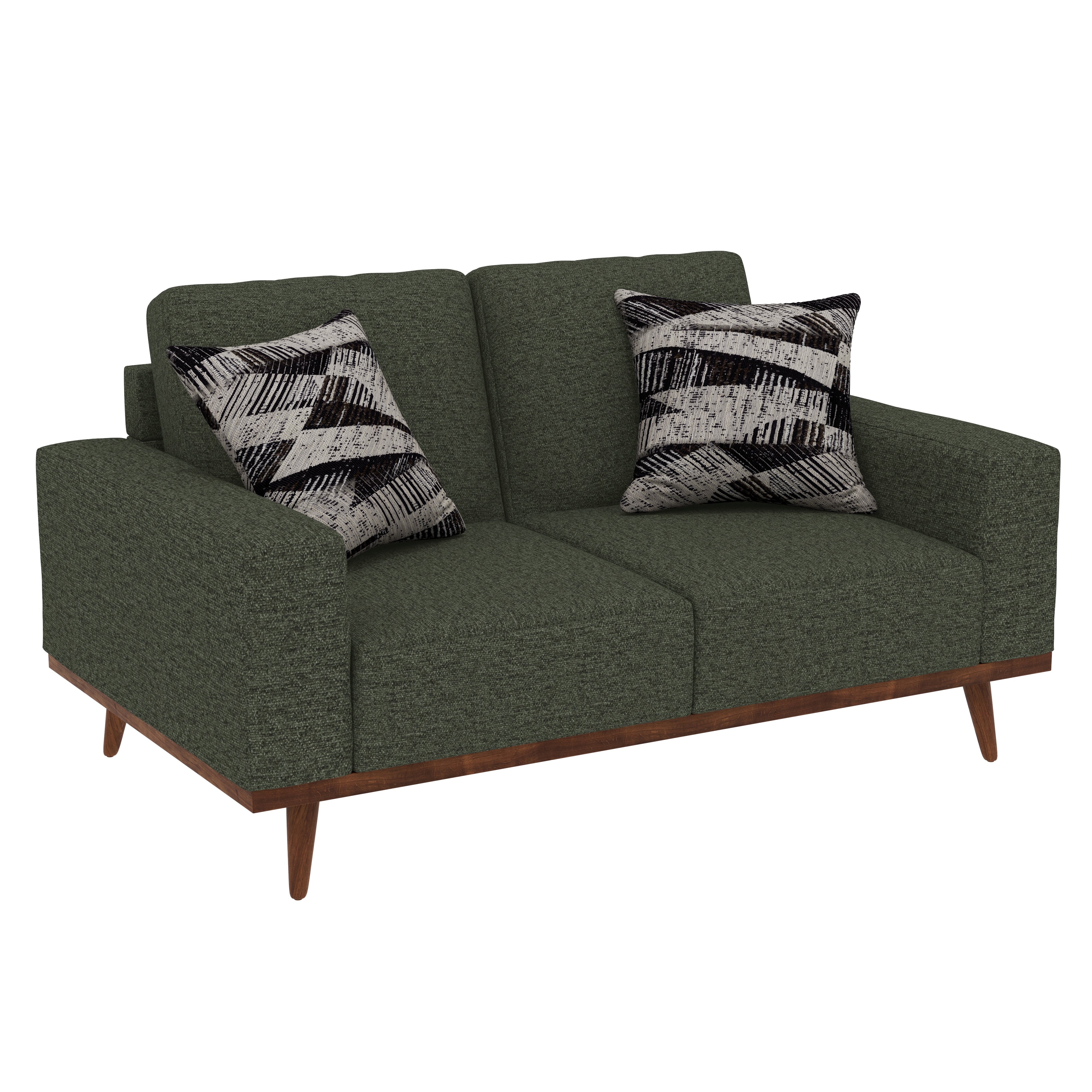 The exposed wood leg and tapered leg design gives this loveseat a sleek, contemporary look that complements a variety of decorating styles. The dark olive color is rich and versatile, making it easy to pair with other furniture pieces and accessories. Plus, the two toss pillows in a palmidi pattern add a touch of elegance and sophistication to the overall design.