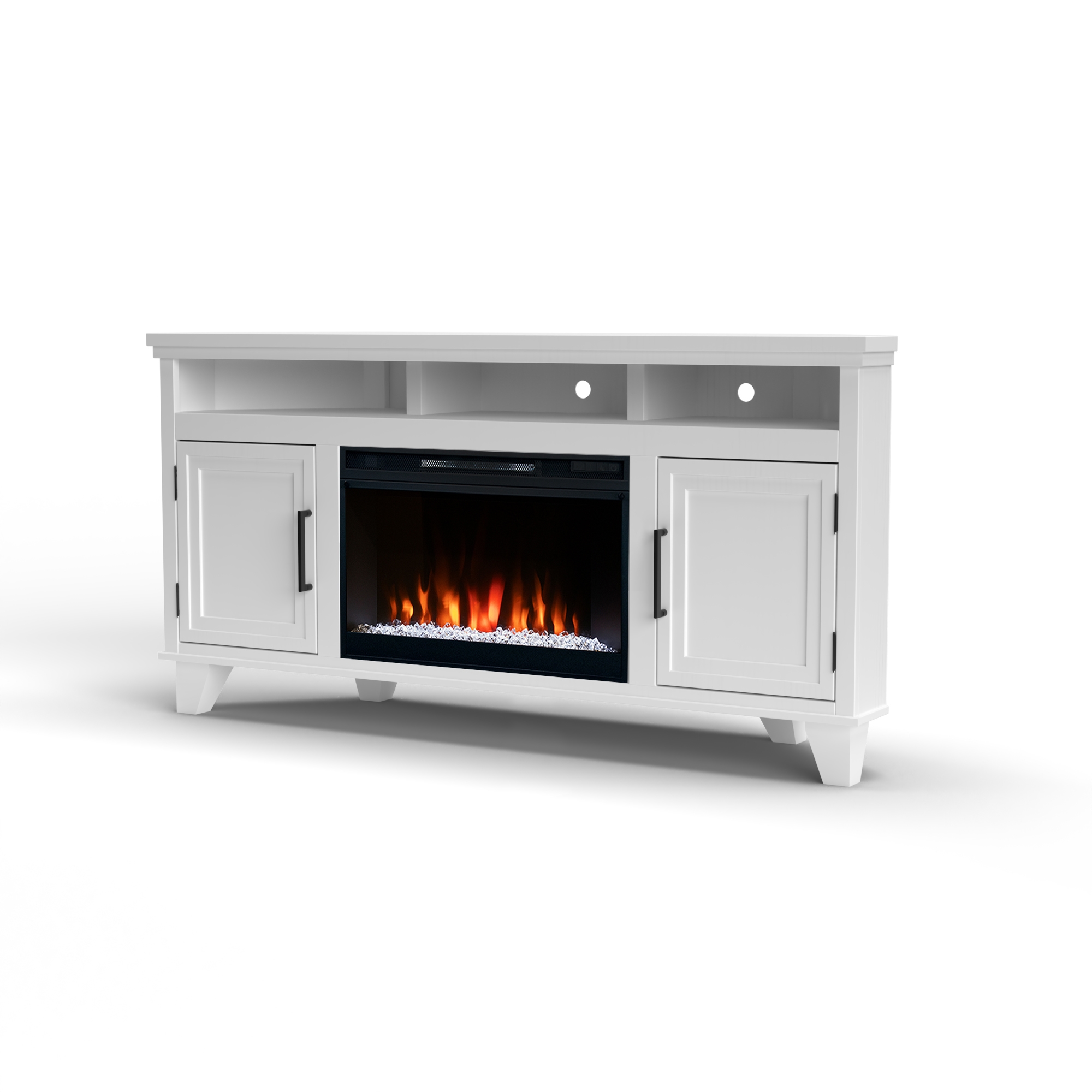 moreThis 64" corner fireplace TV stand is the perfect addition to any room, combining a cozy fireplace with ample storage and display space for your TV and media accessories. Made in the USA from high-quality poplar solids and okoume veneers, this transitional-style TV stand features a beautiful white finish with satin black hardware, creating a sleek and sophisticated look that will complement any home decor.