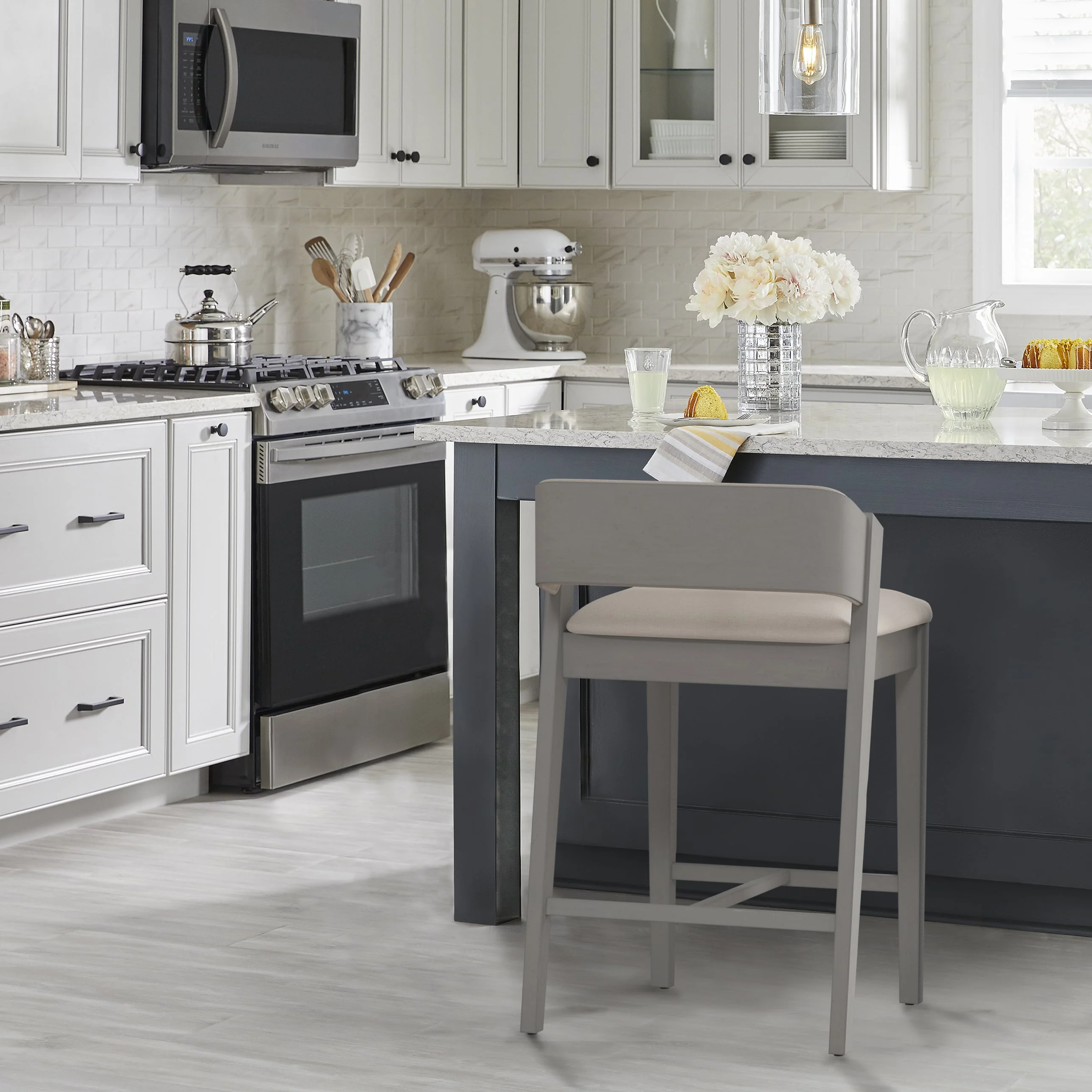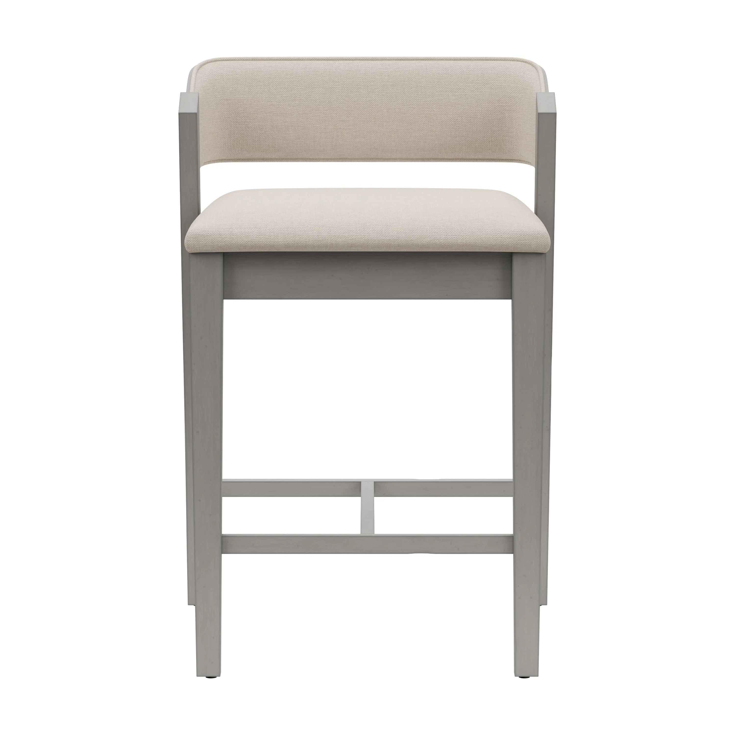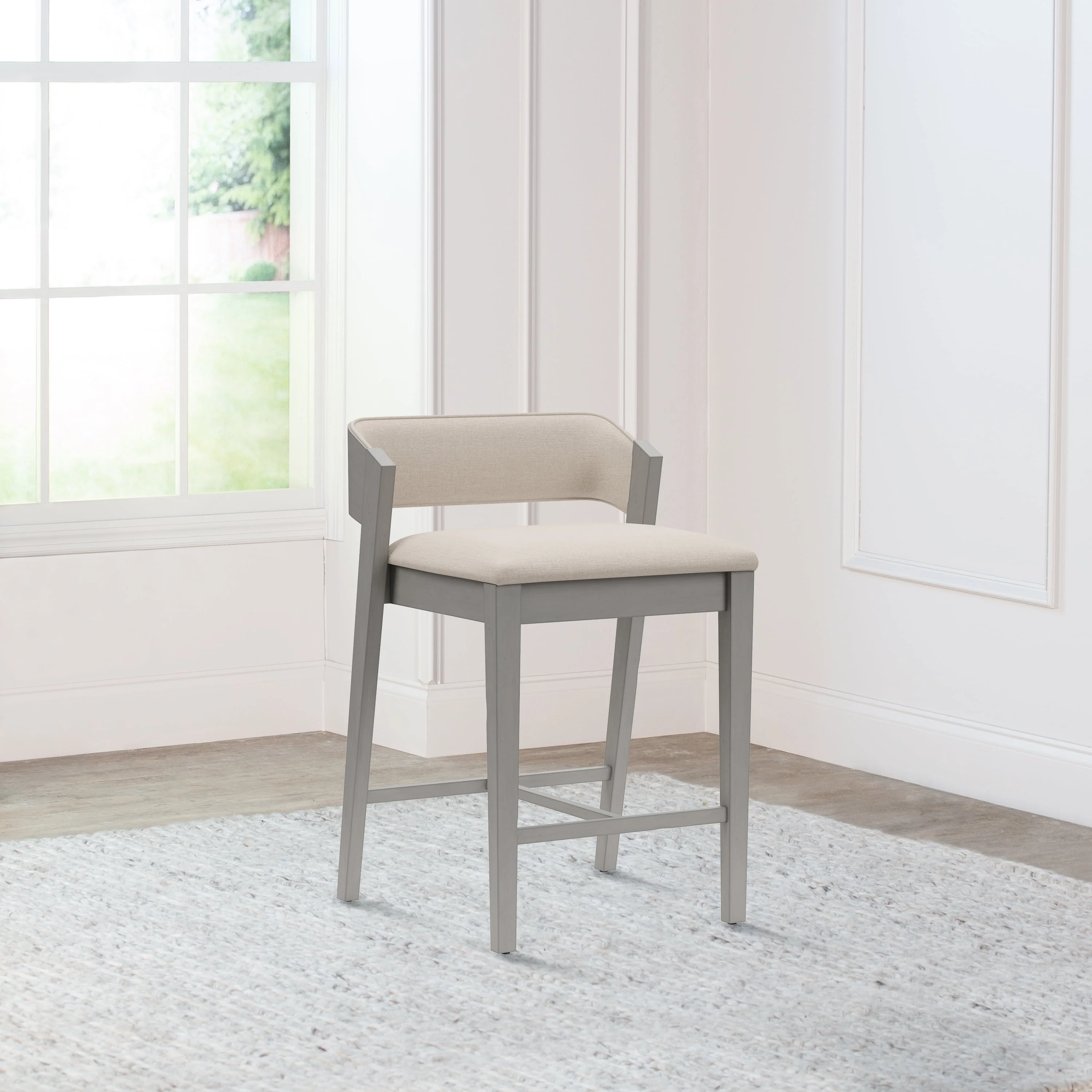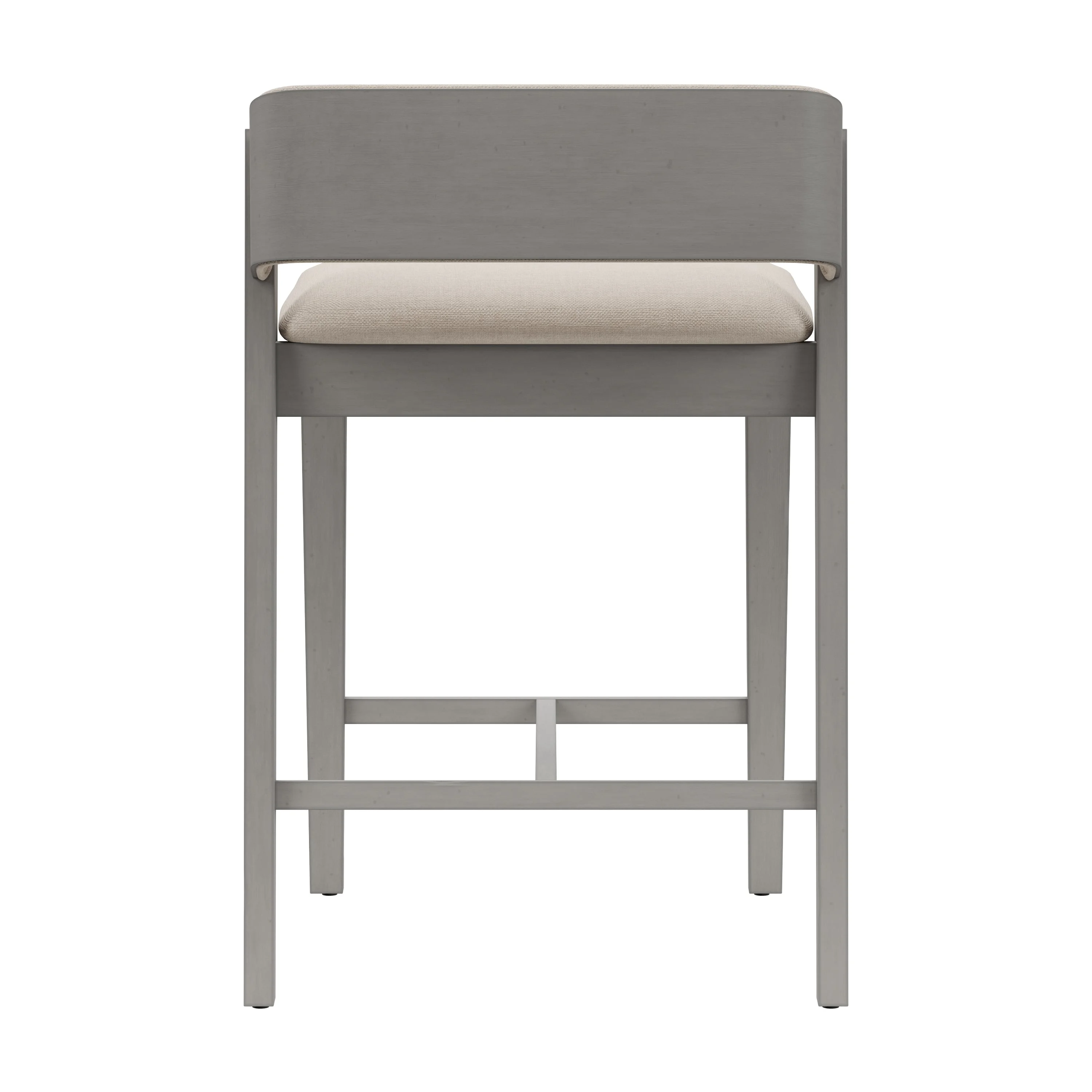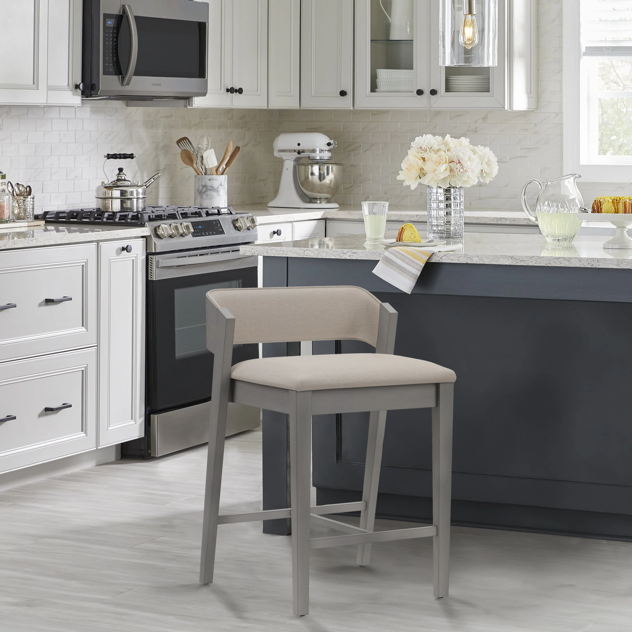 The framework of this counter height stool is sleek and styled for comfort. The upholstered back and seat boast a light beige fabric accented by a distressed gray finished wood frame. The wood extends around the low-profile back, which is set at a comfortable and attractive angle, further accentuating the stool’s midcentury modern appeal. With a footrest perfectly placed for added comfort, this generously sized counter height stool is a sensible and stylish seating option for your kitchen or dining area.