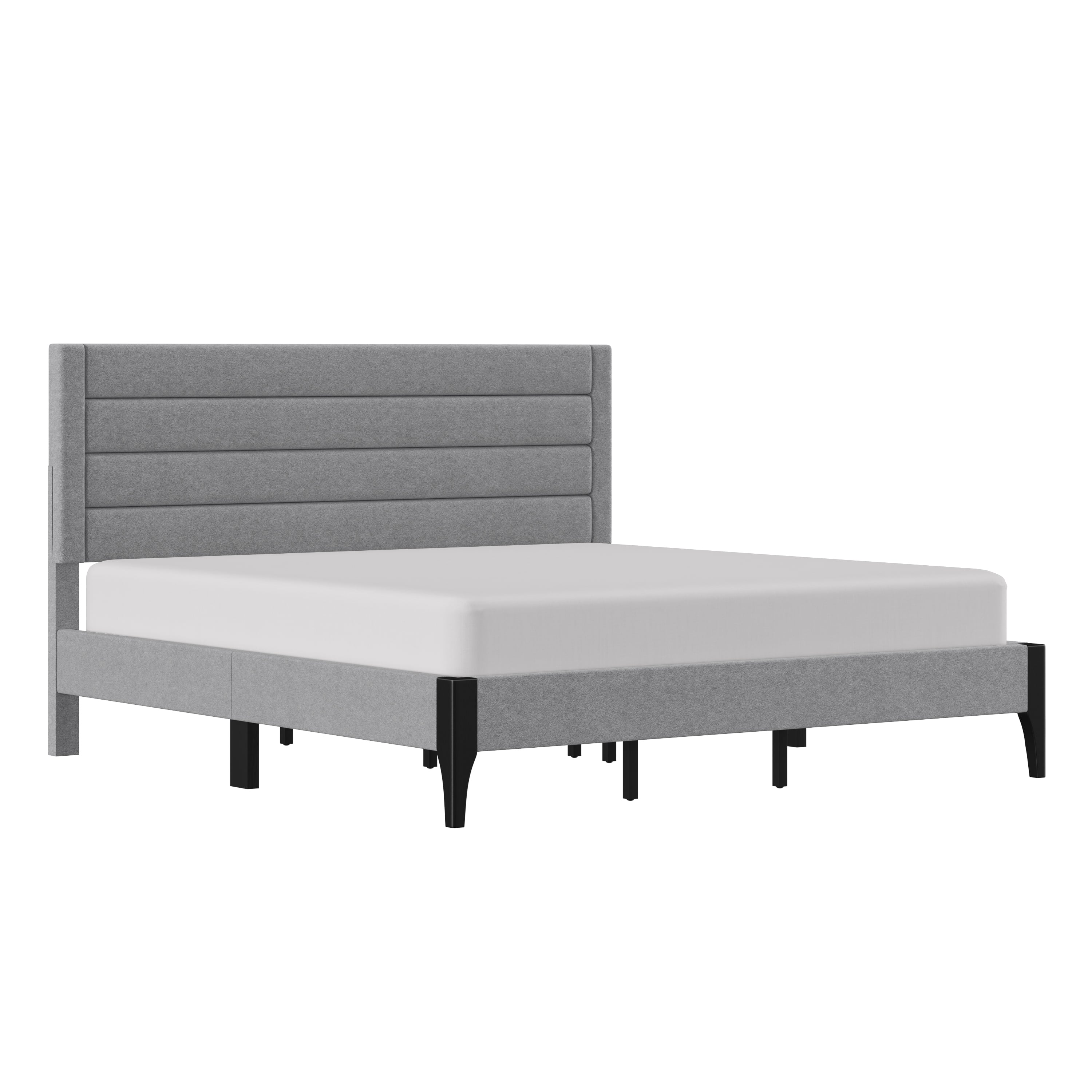 Platform construction doesn’t require a box spring, 600 lb. Recommended weight capacity, For residential use only, MDF (Medium-Density Fiberboard), Plywood, Rubberwood construction upholstered in 100% polyester fabric in a light gray; Footboard legs and support legs are finished in black, Assembly required, Contemporary modern king platform bed features a headboard with horizontal channel tufting set within a vertically tufted border, Item will ship in one box, Light gray upholstery contrasts with the black footboard legs to chic effect