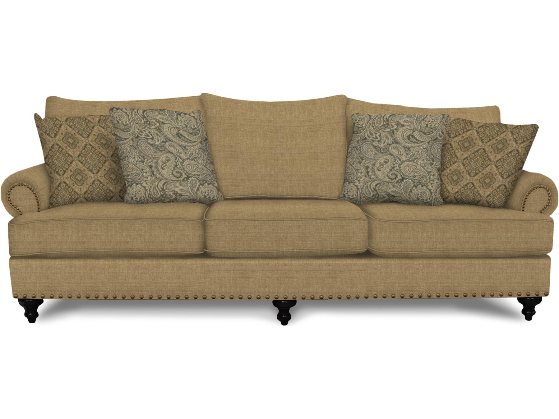 moreThis charming sofa is the perfect addition to any living room, bringing a touch of traditional elegance to your space. With its classic rolled arms and turned wood legs, it exudes a sense of timeless sophistication. The ventilated and reversible seat cushions allow for optimal airflow and easy maintenance. The traditional design is elevated by the beautiful brass nailhead trim, adding a touch of luxury to the overall look. One of the standout features of this sofa is its customizability. With a variety of fabric options available, you can choose the perfect color and pattern to match your home's unique style. Constructed with high-quality materials and built to last, this sofa is a worthwhile investment for any homeowner. Whether you're looking to add a touch of elegance to your living room or simply want a comfortable and stylish place to sit, this sofa is an excellent choice.