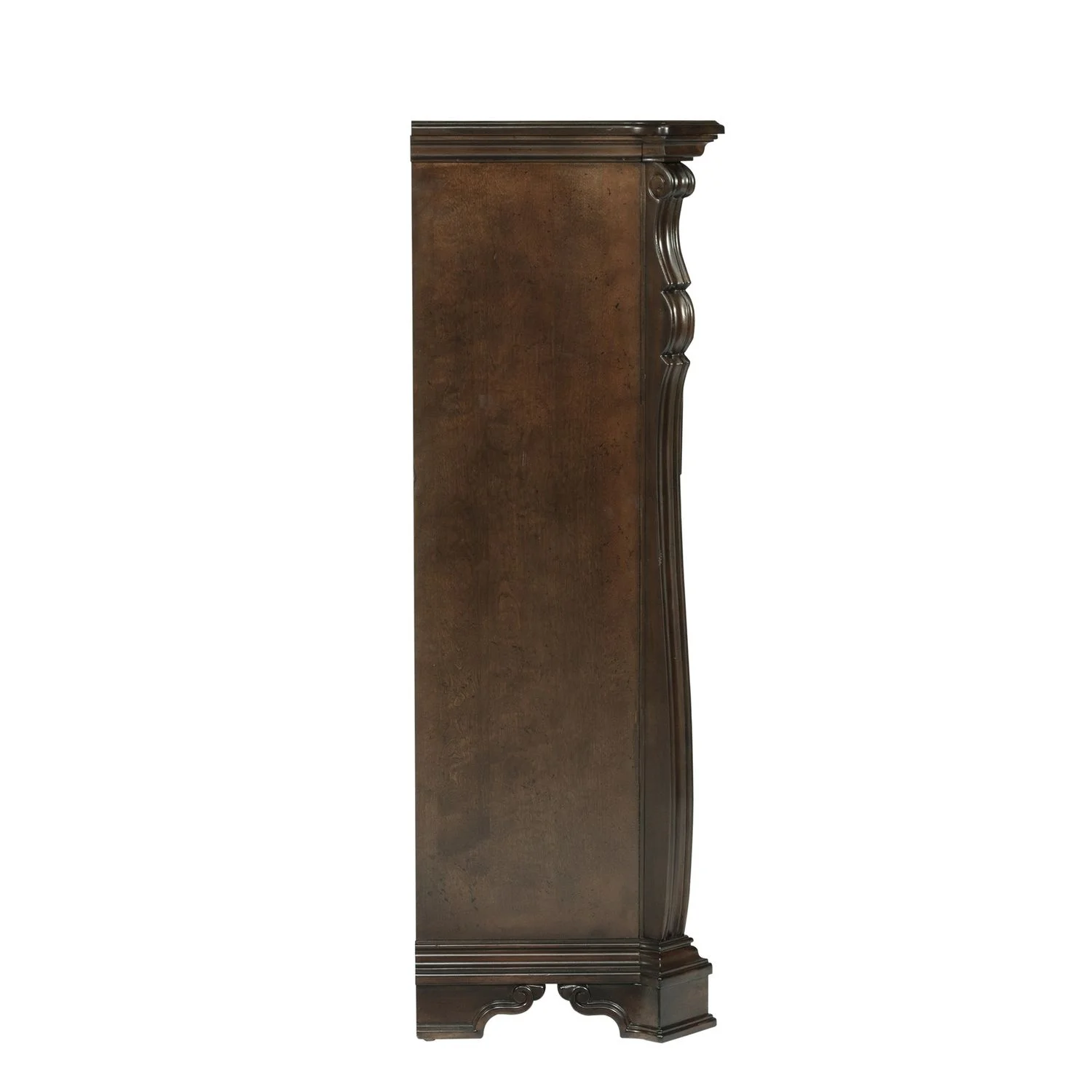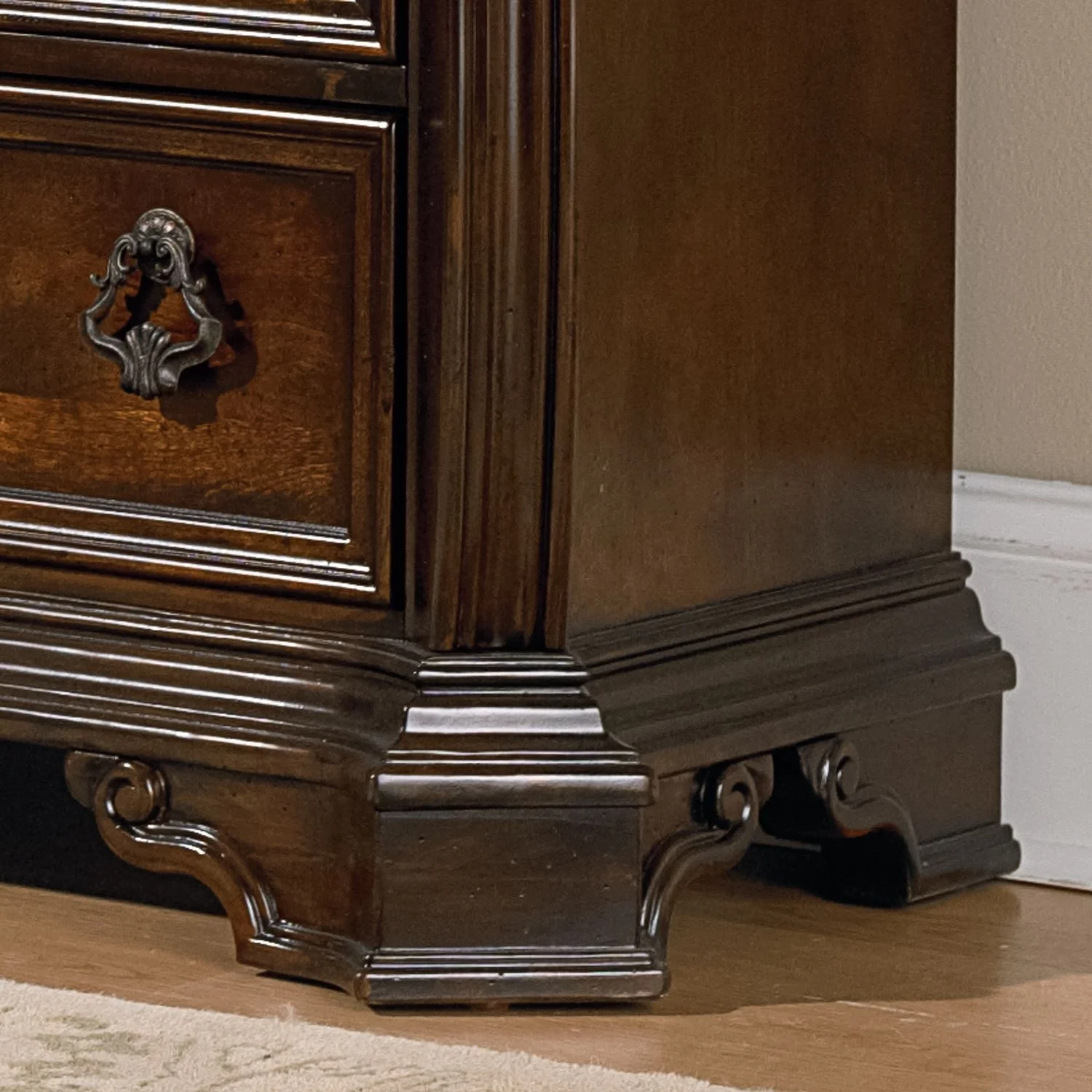 For a time-worn elegance and unmistakable refinement, choose the Arbor Place collection. Pieces from Arbor Place showcase sweeping outlines and intricate shaping, presenting a distinct traditional look perfect for your home. Signature scrolled burnished brass inserts appear on the sleigh headboard and landscape mirror. All case pieces feature shaped pilasters, scrolled bracket feet, rope twist detail, and step moulding. The china cabinet top features an intricate decorative vine motif. Dovetailed drawers on full-extension metal glides are adorned with burnished brass drop-ring and knob hardware. Mix and match Arbor Place pieces for a stunning traditional home setting.