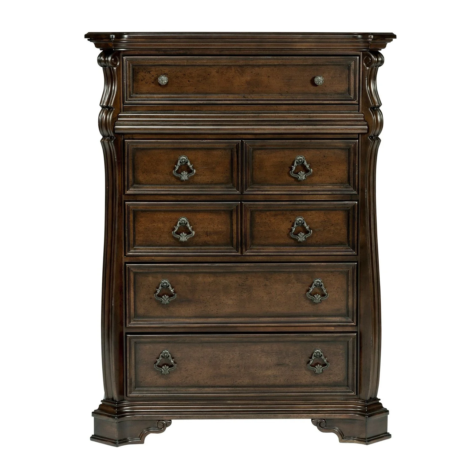 A commanding presence among your home furnishings, this traditional six-drawer chest offers a host of versatile storage options and breathtaking details. Crafted from poplar solids and birch veneers with a rich Brownstone finish, this chest showcases intricate shaped pilasters, rope twist mouldings, and scrolled bracket feet. All drawers feature English dovetail construction and full extension metal guides, while the top drawer is lined in felt to protect delicate jewelry and accessories. Ornate burnished brass drop-rings and burnished brass knobs adorn the drawer fronts, contributing additional visual interest. An essential storage piece, this chest contributes ample function and style to your living space.