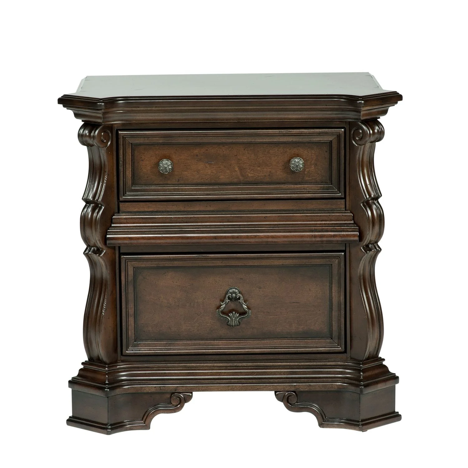 For a time-worn elegance and unmistakable refinement, choose the Arbor Place collection. Pieces from Arbor Place showcase sweeping outlines and intricate shaping, presenting a distinct traditional look perfect for your home. Signature scrolled burnished brass inserts appear on the sleigh headboard and landscape mirror. All case pieces feature shaped pilasters, scrolled bracket feet, rope twist detail, and step moulding. The china cabinet top features an intricate decorative vine motif. Dovetailed drawers on full-extension metal glides are adorned with burnished brass drop-ring and knob hardware. Mix and match Arbor Place pieces for a stunning traditional home setting.