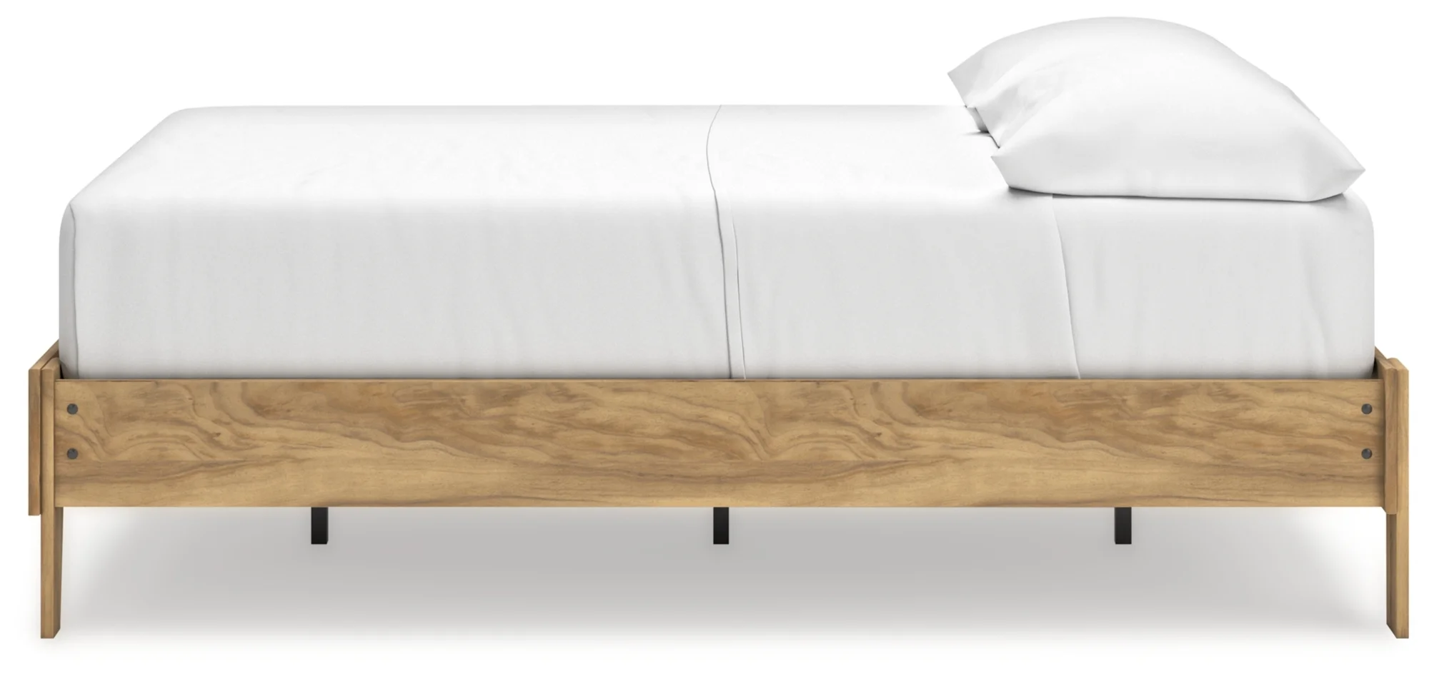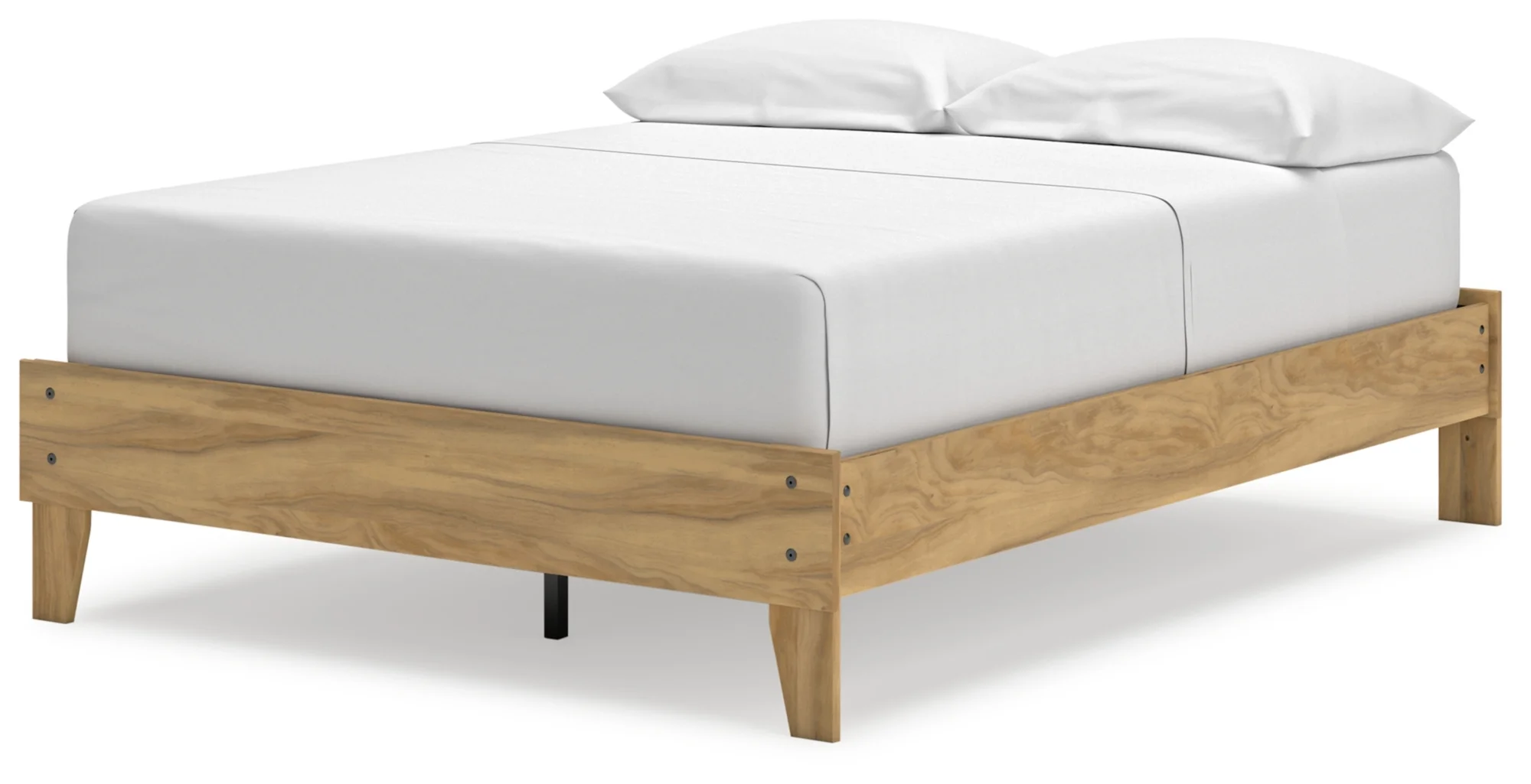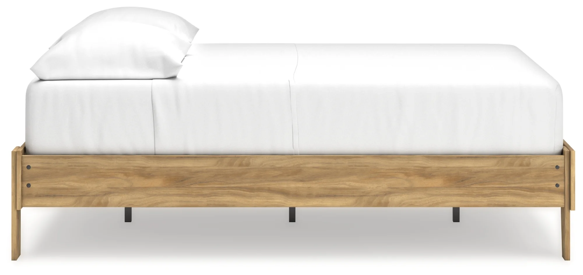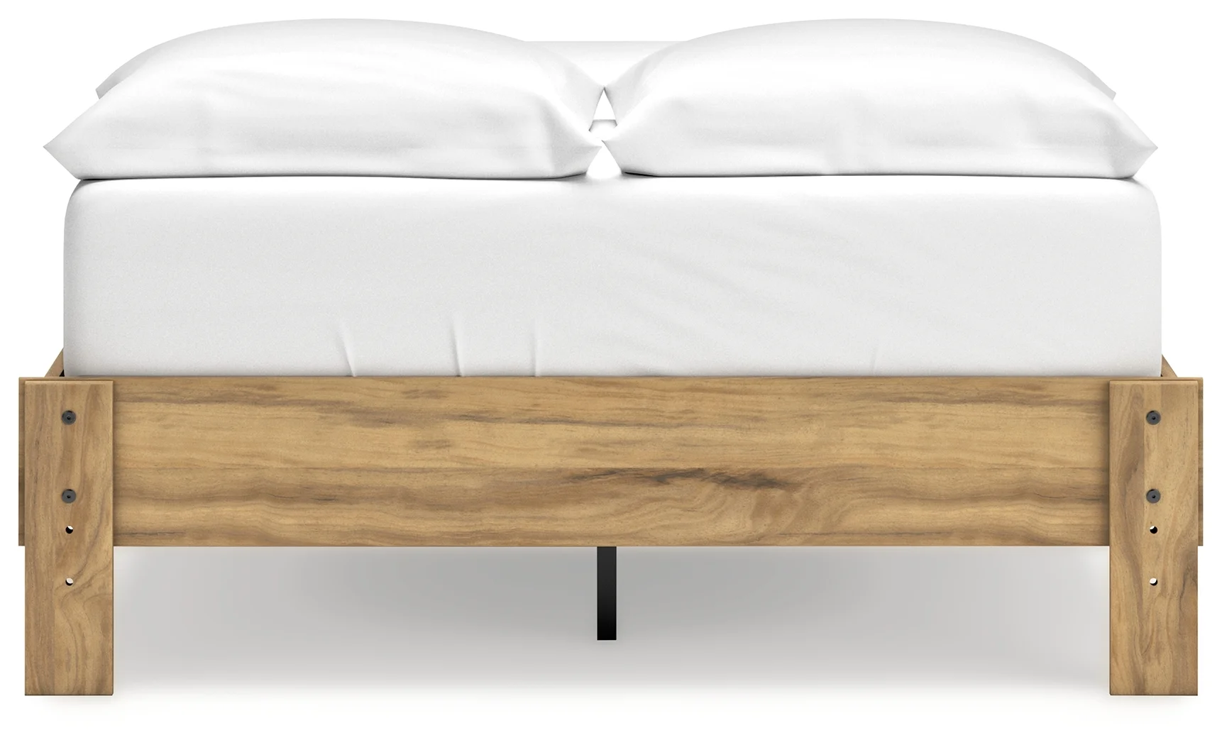 Full platform bed (does not include headboard), Made with engineered wood (MDF/particleboard/plywood) and decorative laminate for the right balance of affordability and durability, Warm, rich light brown finish over replicated hickory grain, Decorative laminate replicates natural or man-made material surfaces with consistent color, pattern and texture, Bed does not require a foundation/box spring, Mattress available, sold separately, Assembly required