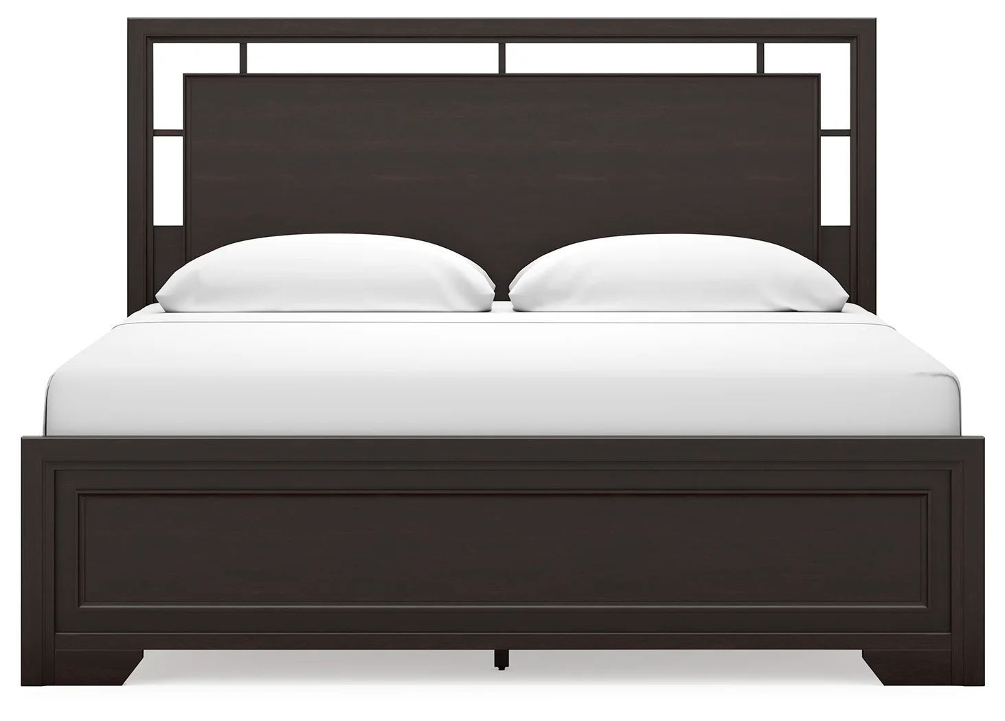 Includes panel headboard, footboard, rails and slats, Made with hardwood solids, engineered wood veneer and MDF substrates, Dark brown finish, Floating panel headboard, Picture frame footboard, Foundation/box spring required, sold separately, Mattress available, sold separately, Assembly required