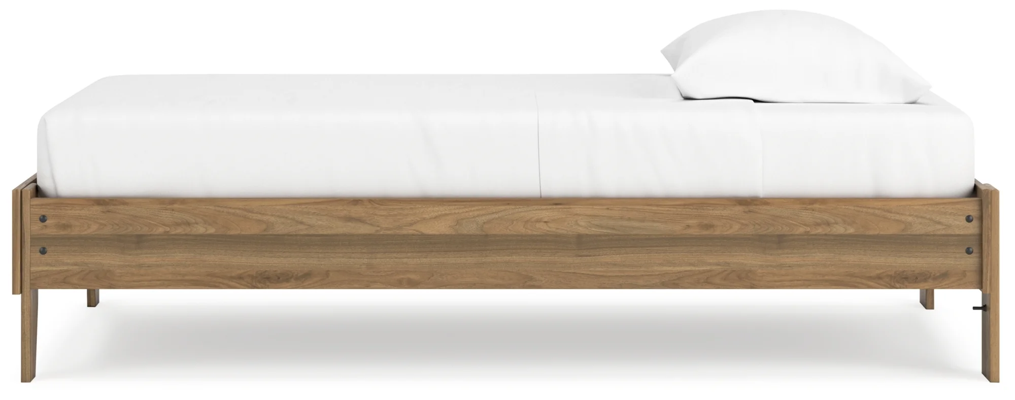 Twin platform bed (does not include headboard), Made with engineered wood (MDF/particleboard/plywood) and decorative laminate for the right balance of affordability and durability, Rich honey brown finish over replicated walnut grain with authentic touch, Decorative laminate replicates natural or man-made material surfaces with consistent color, pattern and texture, Bed does not require a foundation/box spring, Mattress available, sold separately, Assembly required