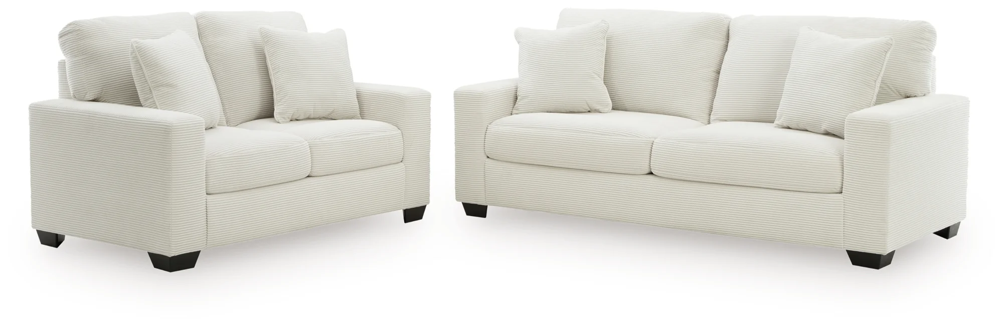 moreThe crisp neutral hue and striking design details of this seating set create a living room that expertly reflects your modern taste. For irresistibly cool textural appeal, the ultra-soft fabric is enhanced by a small-scale corded look. With a clean-lined silhouette complete with track arms, this sofa chaise allows you to take a trend-right approach to everyday living.